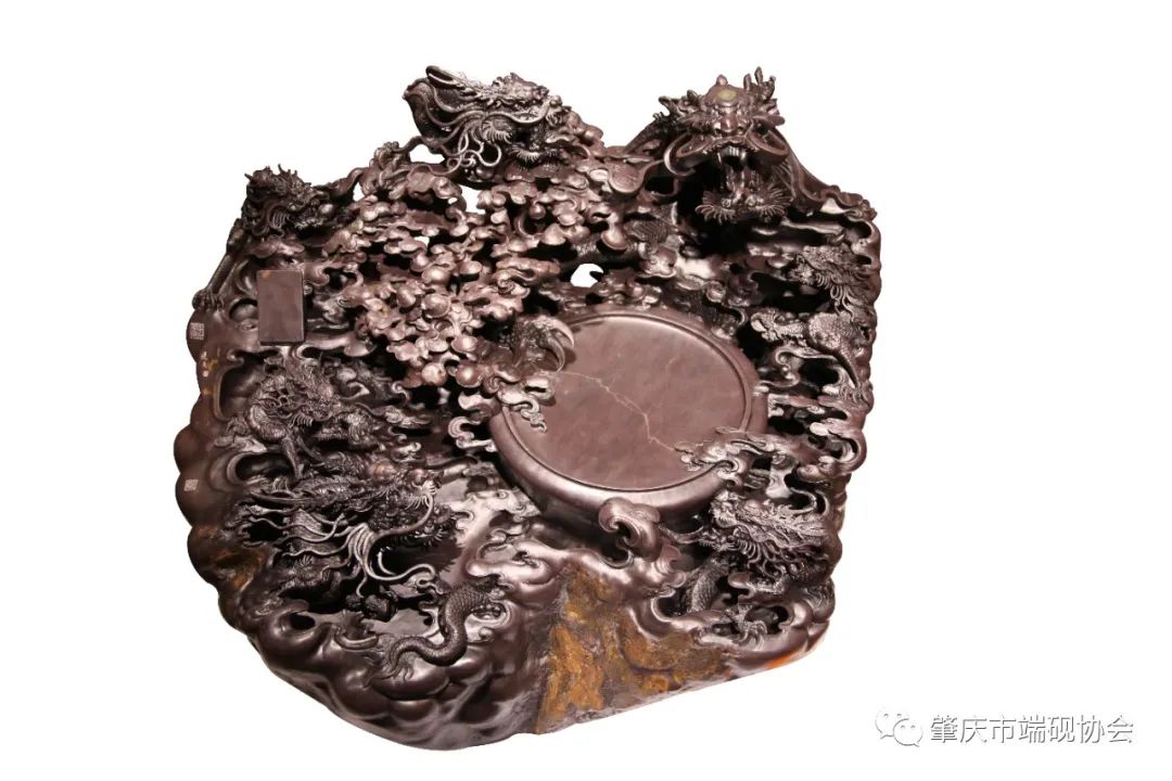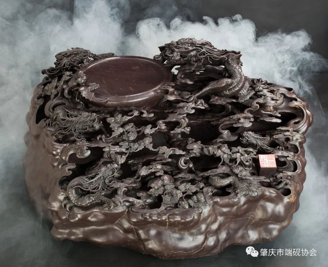 龙是端砚创作的传统题材,因有特殊的含义而广受人们的钟爱。中国的神话与传说中,龙作为一种吉祥物,与凤、龟、麟一起为“四灵”,是一种神异动物,是中华民族的象征。这件端砚为罗家爷孙三代的经典力作,跨越近一个世纪的创作,展现“罗家云龙”的威严和气势。体现着一方砚作、一个家族、一种技艺、一份传承。
