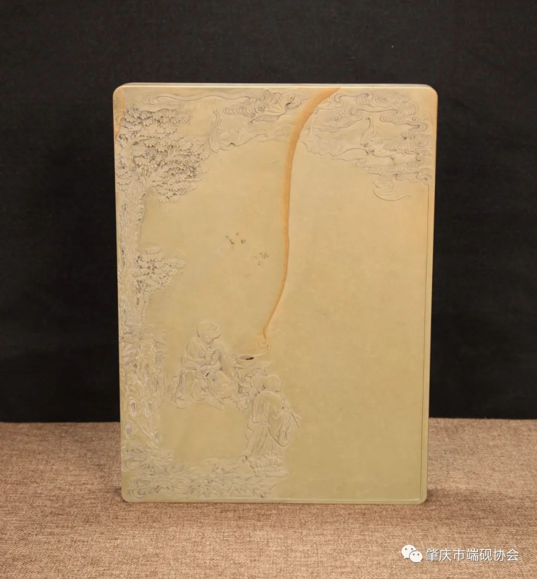 此砚以绿端石材制作,绿端始见于北宋,矿脉主要分布在今高要市小湘三榕峡,后在斧柯山的朝天岩附近也发现绿端。绿端大约有青绿色和青黄色两种,以翠绿色为优,当地人称“绿豆青”。此件作品描绘了“和合二仙”,砚中刻画了两个笑容可掬、蓬头垢面的和尚,一手持荷叶莲花,谐音“和”,一手捧宝盒,谐音“合”,代表着人们美好的愿望,愿新人百年好合、家庭团结和睦。