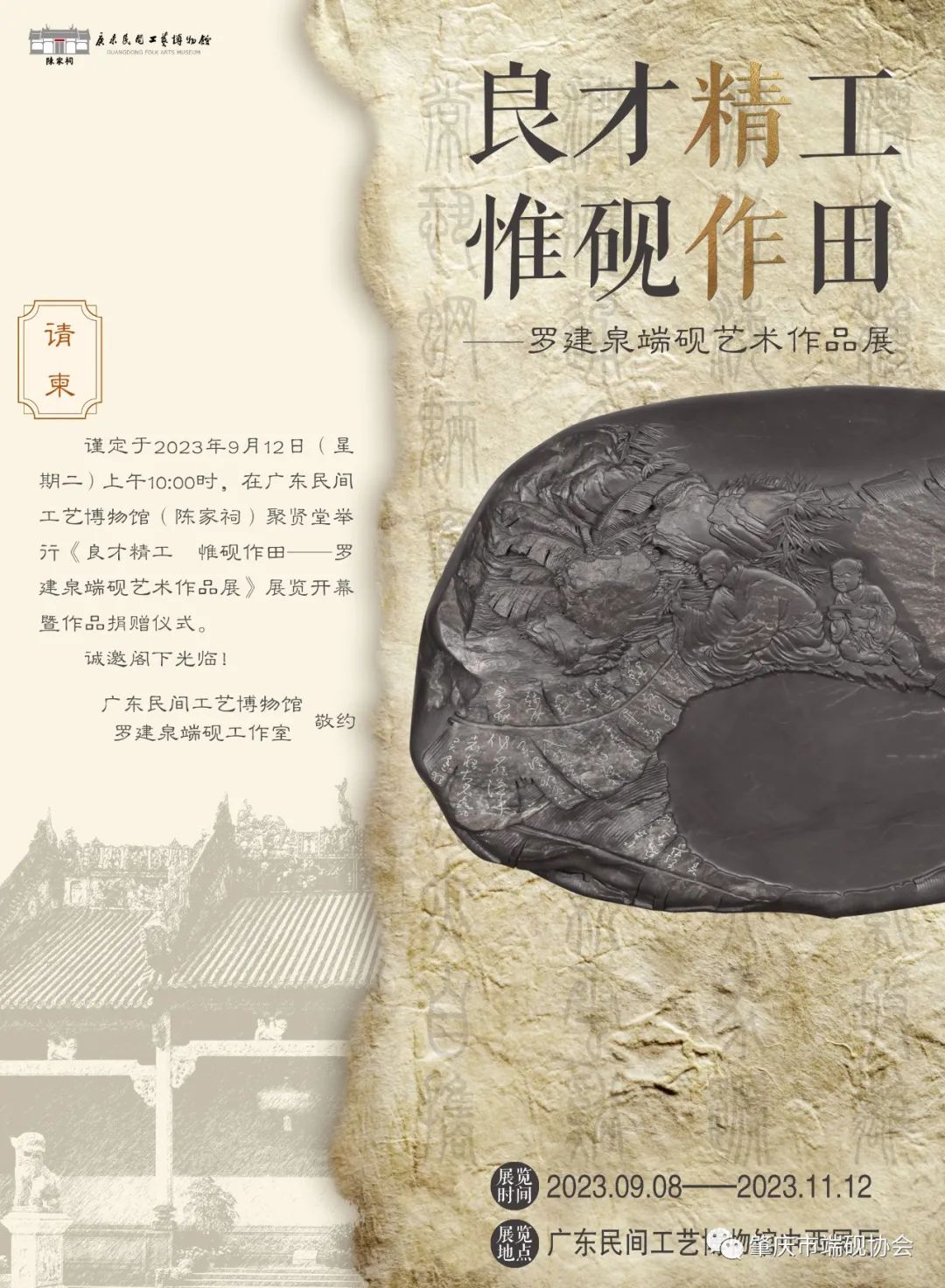 “良才精工 惟砚作田——罗建泉端砚艺术作品展”于2023年9月8日至11月12日在广东民间工艺博物馆中西展厅举办。