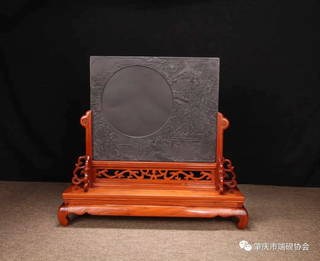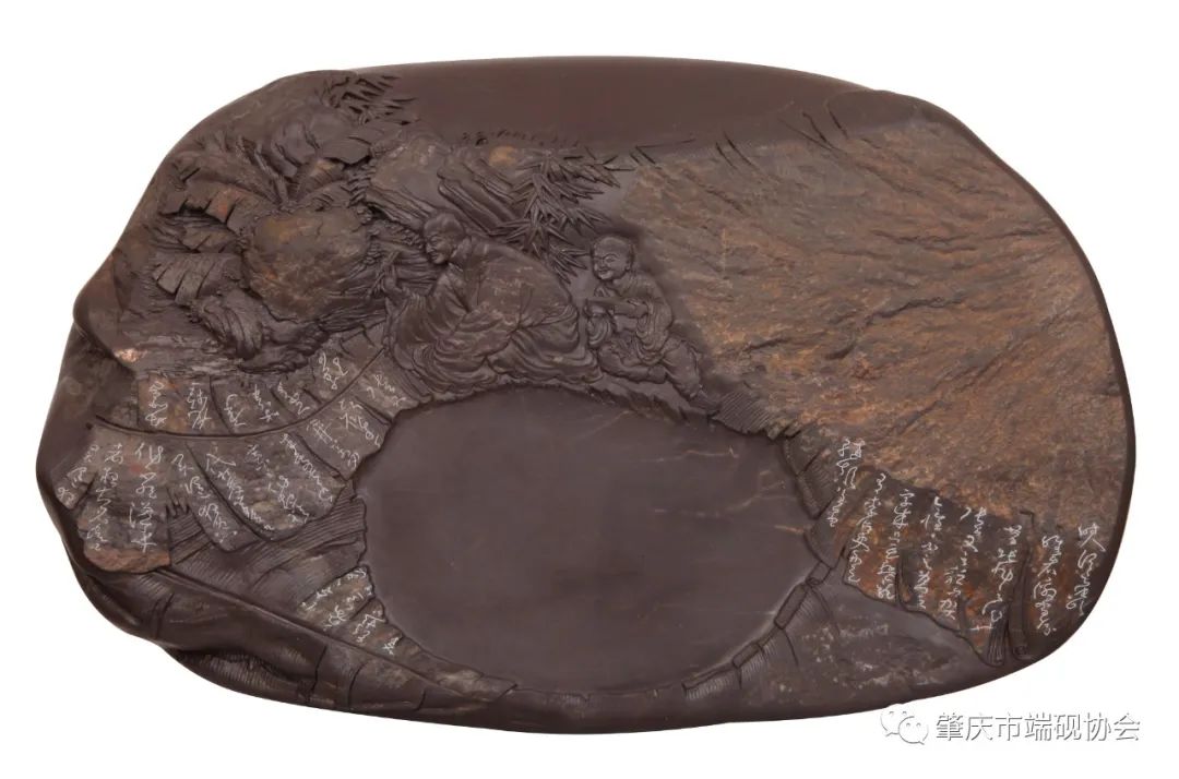 此砚为端溪三大名坑之一的坑仔岩石材制作。西园雅集是北宋元丰时期一次著名的文人集会。西园为北宋驸马都尉王诜在汴京的府第,王诜曾邀请苏轼、黄庭坚、米芾、李公麟等当时的名流十六人游园。集会之后,著名画家李公麟作画描绘了雅集盛况,后世许多著名画家都曾临摹。此砚即以此传世名画为蓝本,在砚面偏左位置,开辟圆形砚堂,展现出胭脂晕、蕉叶白和青花等石晶花纹,砚堂周边以浅浮雕技法刻画了曲桥、流水、假山、林木等美丽的园林风光,以及人物在其间的游览、品茗、赏画、读书等活动。雕工精致细腻,人物形象栩栩如生。砚面上的石眼刻画祥云纹烘托,增添了富贵吉祥气氛,十分契合上流社会宴游子乐的情景。整幅画面美轮美奂,很具欣赏性。