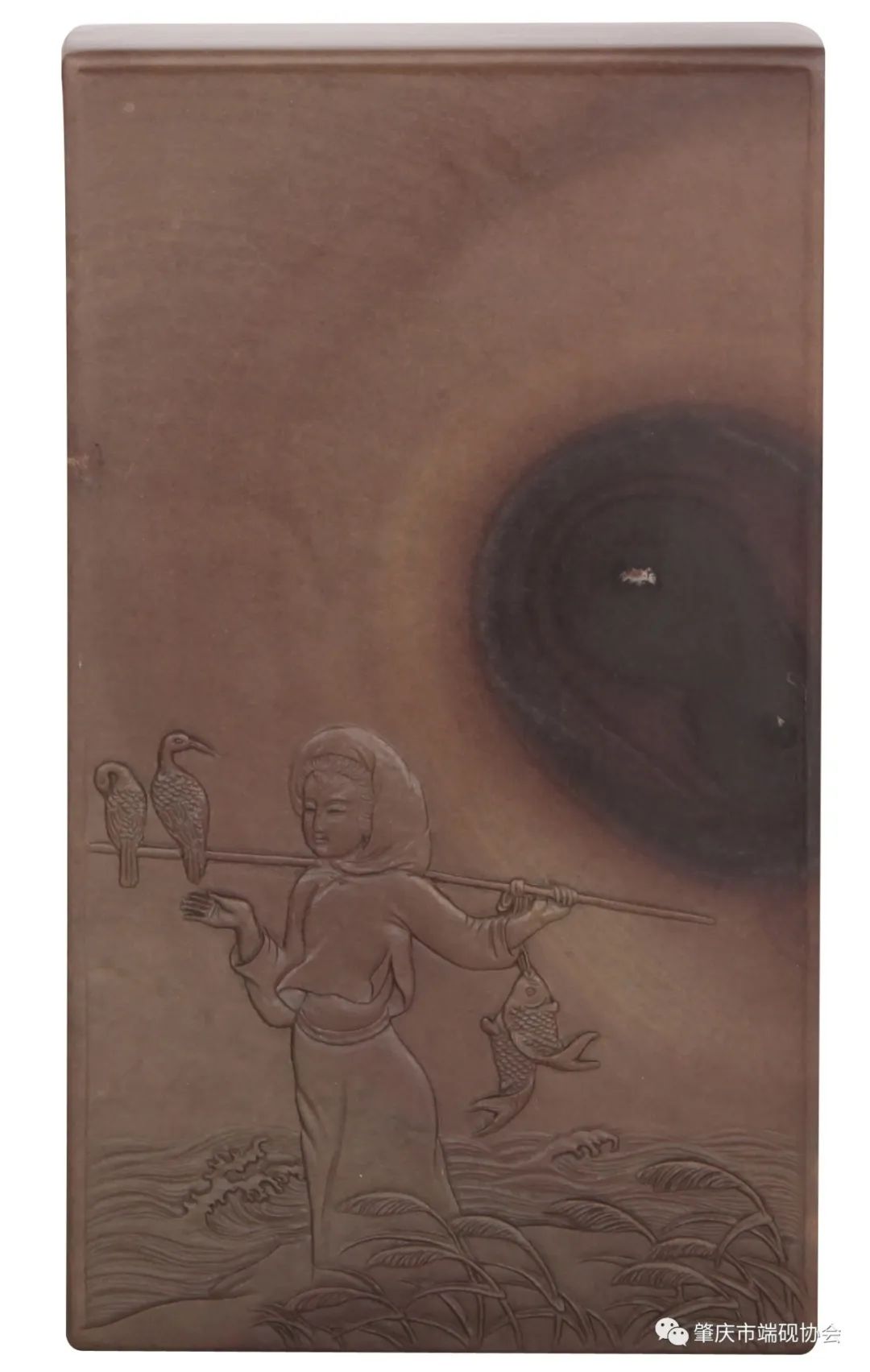 此砚以宋坑石材制作,巧妙的运用石纹描绘了月光下渔民丰收的场景。作者依随砚石的石品花纹刻画月亮及月亮周围的光晕栩栩如生,同时用浅浮雕的雕刻技法在砚石的另一侧刻画出渔民打鱼的场景,渔民的鱼竿上挂着两条刚打上的鱼,另一侧则站立着刚飞上的小鸟,身边还刻画了水波和芦苇呈现出温馨且生动的场景。