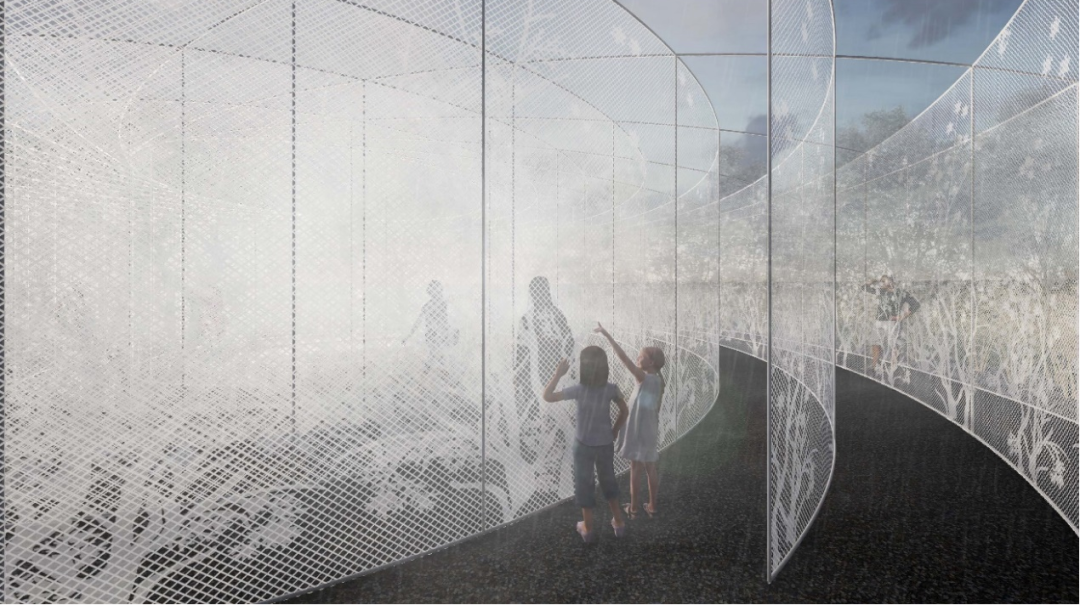 如果在想象中把竹杆或灯笼横切开,会看到它们的内部是空洞,而外部是一圈圆形的、看不透的表层。这座花园的结构正是源于这一“空心竹灯”的意象:它由一层层编织网的墙,组成同心圆外层,编织网上是半透明的植物图案。层层重叠的图案和影子,环绕着花园的中央,那里有一团发光的雾气,仿佛灯笼的光。