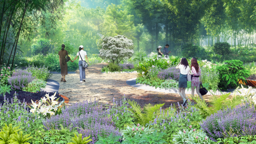 Tall bamboos are randomly distributed in groups of different sizes, while shorter scattered bamboos and undergrowth shrubs form a rich spatial structure of the woodland. The meandering walkway weaves in and out of the forest, forming a complete story line of the large and small exhibition gardens, and the undergrowth is made up of Chinese herbs with ornamental value and other evergreen undergrowth, which is interesting; the visitors can enjoy a rich visual experience and at the same time, learn about the background and driving force of the park city of Chengdu as well as the opportunities for the development of the horticulture industry from the perspective of horticulture and plants. The land of Tianfu will blossom, and all gardens will eventually return to their source.