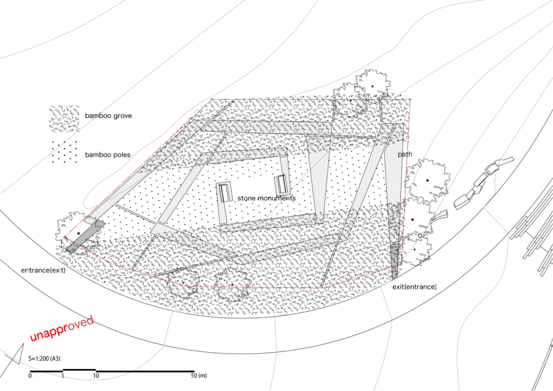 Everything in this garden will return to earth after the festival. Poles will decay under the rain and wind and the path will fade into the sod, while bamboo roots will express vitality by covering all over the garden in the near future. Nothing but the monolith, a pair of benches, will inherit the fact that many people walked this place in 2024.