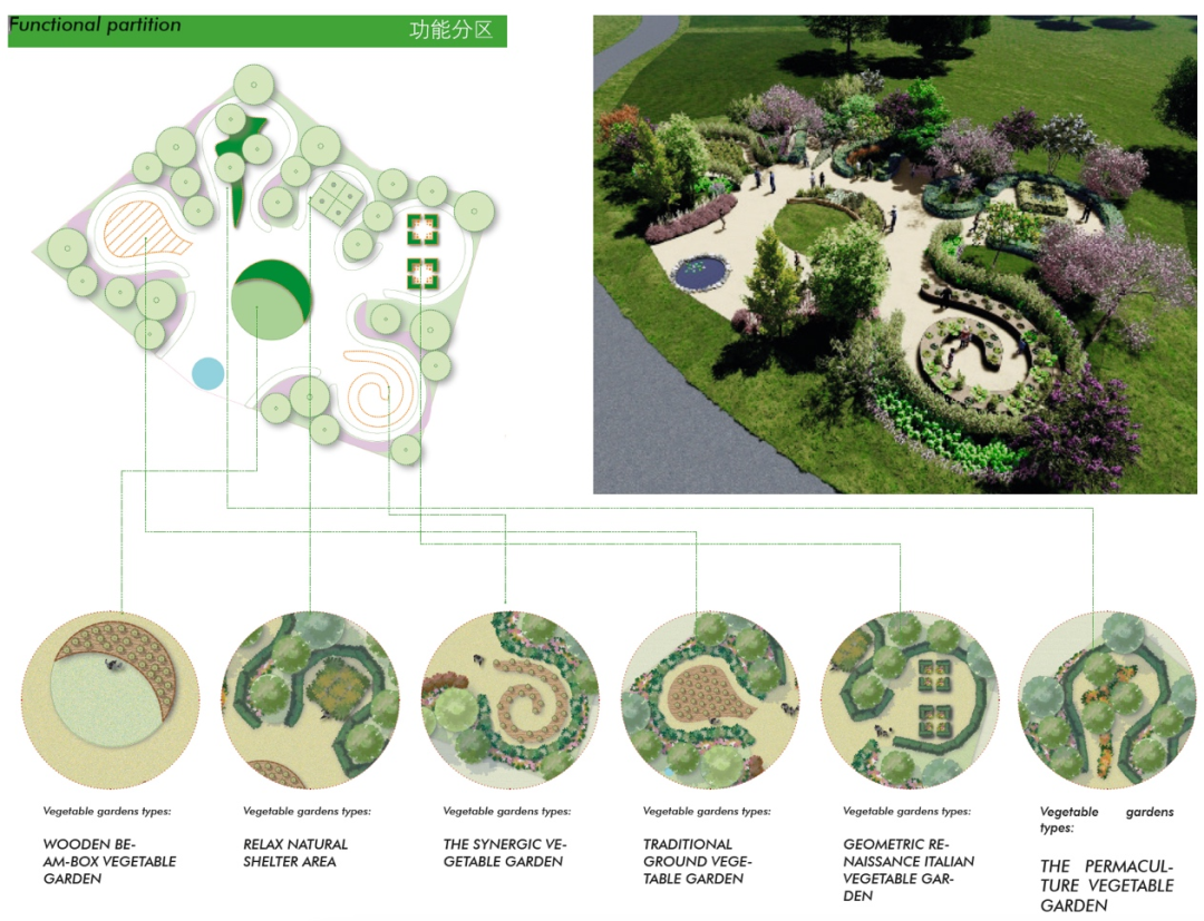 该设计由6个区域组成,代表了从传统到现代的不同类型的菜园:由各国家典型果树构成的古典平地果园;文艺复兴时期的菜园,由几何形的植物边界和内部的花卉和蔬菜组成,就像欧洲修道院的传统一样;永续栽培区,由几种尺寸的可食用植物自由搭配;协作菜园,以螺旋形状与精确选择的蔬菜构成。中央区域是木梁菜园,呈 "环抱 "状,供人们在前方草坪上休息。北面的区域专门用于遮阳避雨。