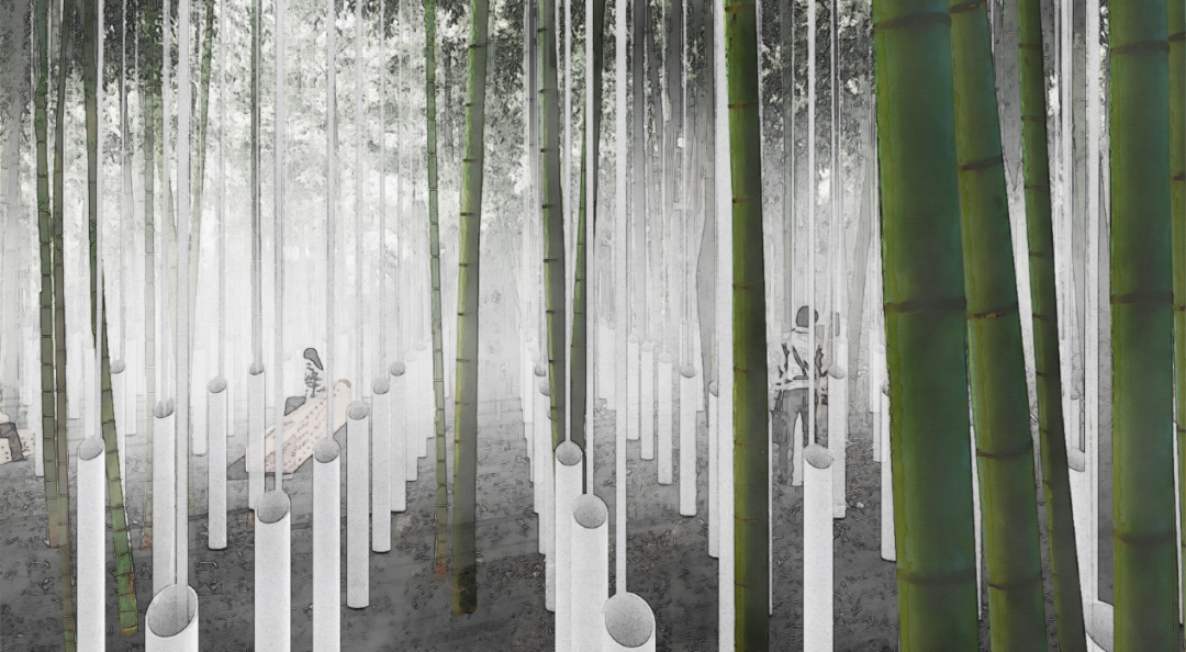 The garden is designed as a grove. The pattern of light and shade with the breeze of leaves invites visitors into the garden. The grove is composed of the gradual integration of natural and artificial elements. The former consists of living bamboo planted for the festival, while the latter comprises bamboo poles constructed in a grid layout. It is not until turning several corners of the path which eventually brings visitors through to the bench at the center of the garden, that they notice another bench at the opposite side, which turns out to be the starting point of the way back that represents the essential message of the garden.
