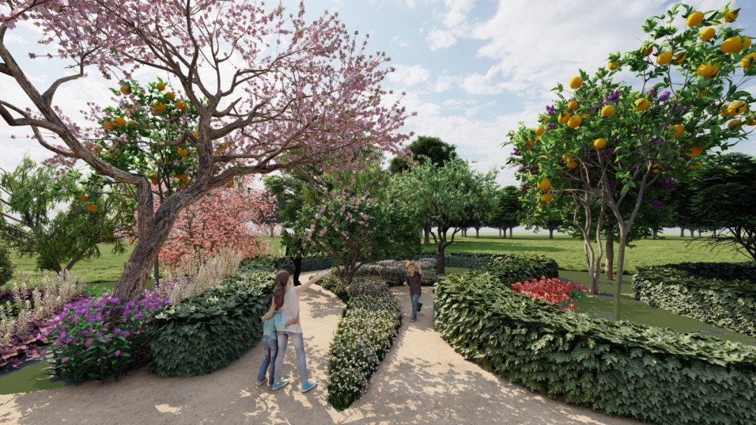 Each area is surrounded by bushes of different plants and dimension and the trees selected are both deciduous and evergreen with several type of fruits trees to create a widespread orchard.