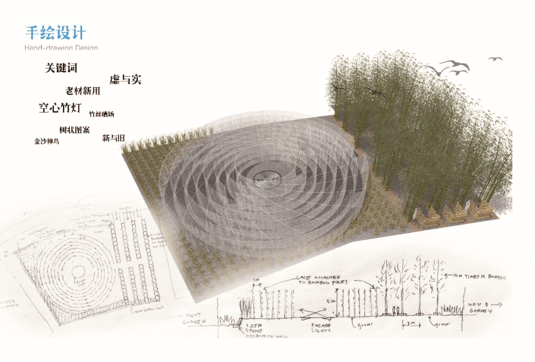 The design is based on the native plants of western Sichuan, with bamboo as the backbone plant, evergreen and deciduous mixed broad-leaved forests as the main canopy trees, as well as groundcover plants with good resistance to reproduce the original Sichuan forest ecosystem, and then through the structures hidden in the bamboo forests and terrain remodelling, to create an exhibition pattern of the "Bamboo Sea and Forest Window". The design will sample the native plant communities in the ancient Sichuan natural environment, use bamboo and trees as the main body to create the basic plant landscape communities, and incorporate the native natural vegetation and typical architectural features of different areas and habitats in Chengdu. The five groups of forest windows with the themes of Bamboo Sea, Forest Village, Park City, Climate Change, and Returning to the Source of the Four Seas are designed to create a classic exhibition garden that integrates plants, culture, and architecture with the bamboo sea as the base.
