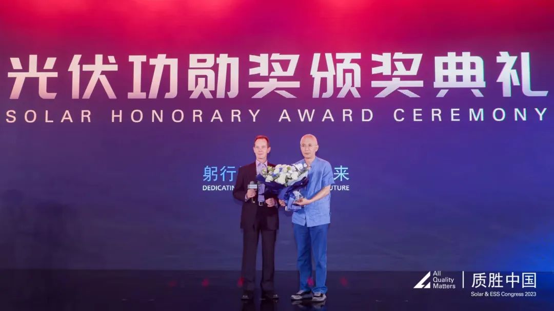 作为每年盛典的重头戏之一,“质胜中国优胜奖”各奖项结果在现场揭晓。今年“质胜中国优胜奖”设有光伏组件、光伏零部件、光伏电站、电力电子四大组别共16个类别的奖项,包括光伏电池片转换效率、光伏封装材料、微型逆变器、组串式逆变器、模块化逆变器、储能电池、工商业分布式光伏项目等优胜奖,充分显示了TÜV莱茵覆盖产业链上下游的影响力和技术实力。最终,20家企业摘得各项殊荣。中国绿色供应链联盟光伏专委会主任沈辉和秘书长吕芳作为颁奖嘉宾之一为获奖企业进行颁奖。同时,沈辉主任还获得了“光伏功勋奖”。