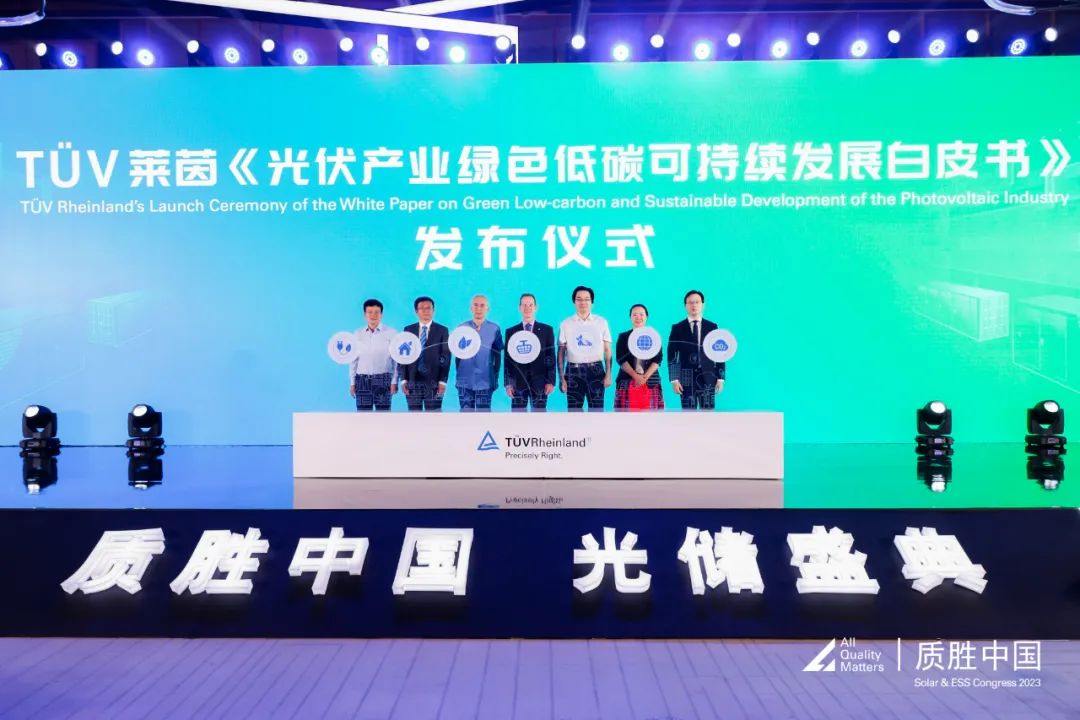 在《光伏产业绿色低碳可持续发展白皮书》发布仪式环节,德国莱茵TÜV太阳能商业与商业产品服务全球副总裁Mr. Frank Piller,德国莱茵TÜV大中华区产品服务事业群副总裁夏波,德国莱茵TÜV全球电力电子产品服务副总裁兼大中华区太阳能与商业产品服务总经理李卫春,中国绿色供应链联盟光伏专委会主任、长三角太阳能光伏技术创新中心主任沈辉,上海交通大学教授、上海市太阳能学会名誉理事长沈文忠,中国绿色供应链联盟光伏专委会秘书长吕芳,绿色能源生态合作组织(PGO)秘书长周元,共同上台见证《光伏产业绿色低碳可持续发展白皮书》发布。