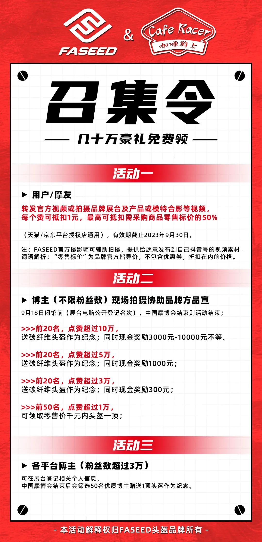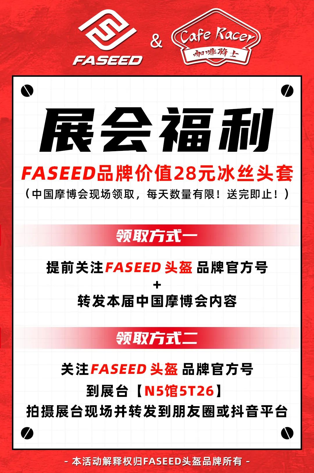 FASEED头盔品牌于2008年在有着“天下第一村”美誉的华西村建厂,于2018年开始在全球运作自主品牌FASEED头盔,90%以上的设计源自于设计师之国—意大利,2008至2018年工厂以ABS材料头盔为主,获得了全球各国的好评与认可,十年磨一剑,2019年开启碳纤维产品的研发与生产,目前工厂员工700余人,产品获得国家多项设计专利与版权专利,每款产品都通过国内外相关安全认证;励志为用户提供更安全、更舒适、更个性、更具性价比的头盔!碳纤维半盔,碳纤维全盔,碳纤维揭面盔(碳纤维下巴)以及ABS材质半盔,全盔,拉力盔,复古盔,揭面盔等FASEED头盔于2018年8月1日在中国正式发售!发售至今,每年都会参加中国摩博会及行业相关活动,通过对用户需求分析,市场调研,研发生产,上市销售,每年用户基数稳定增长。感谢用户、商家、媒体、KOL等合作方的支持与认可!斗罗大陆联名款:每一款都颜值在线,带您走进斗罗世界高端复合材料小号盔型:特别推出一款专门针对小头围、女性、儿童骑手的861mini款也将在中国摩博会与大家正式见面,同样也有斗罗版花,这款配亲子,配闺蜜,配情侣真心又帅又飒,颜值满满。重磅消息:FASEED工厂新品牌【咖啡骑士】也将携新品精彩登场,全国开启招商!为回馈新老用户,本届中国摩博会,不再局限于展馆内,广场N007展位设立了FASEED&咖啡骑士品牌外场售卖区,可现场选购,有特惠价格哦!中国摩博会组委会提醒广大摩友: