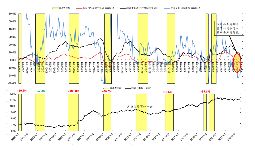 东方证券认为,被动去库存期间白酒走势较好的背后的机制是工业企业等在被动去库存中的经营情况改善,进而拉动了白酒基本面的改善,而随着各类政策出台与落地促进了国内需求的改善,进而推动经济进入被动去库存阶段。复盘2000年以来的被动去库存阶段,除了2012-2013年阶段因为三公消费事件导致板块下跌以外,其余期间白酒板块整体表现良好。其余总计6个被动去库存的阶段中有5个阶段白酒板块实现上涨,平均涨幅39.6%,白酒进入被动去库存阶段意味着白酒即将进入顺周期。