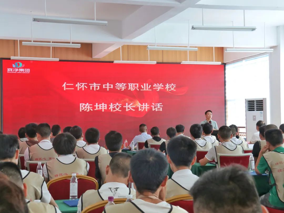 2023年9月7日,仁怀市酱香型白酒产业工人“万人技能培训”金酱酒业第二期制酒工培训班开班仪式在爽净职业培训学校四楼多媒体教室举行,此次参训学员共计85名。仁怀市中等职业学校校长陈坤,贵州省仁怀市茅台镇金酱酒业有限公司车间主任刘佳劲出席仪式并讲话。开班仪式由爽净职业培训学校校长胡国忠主持。