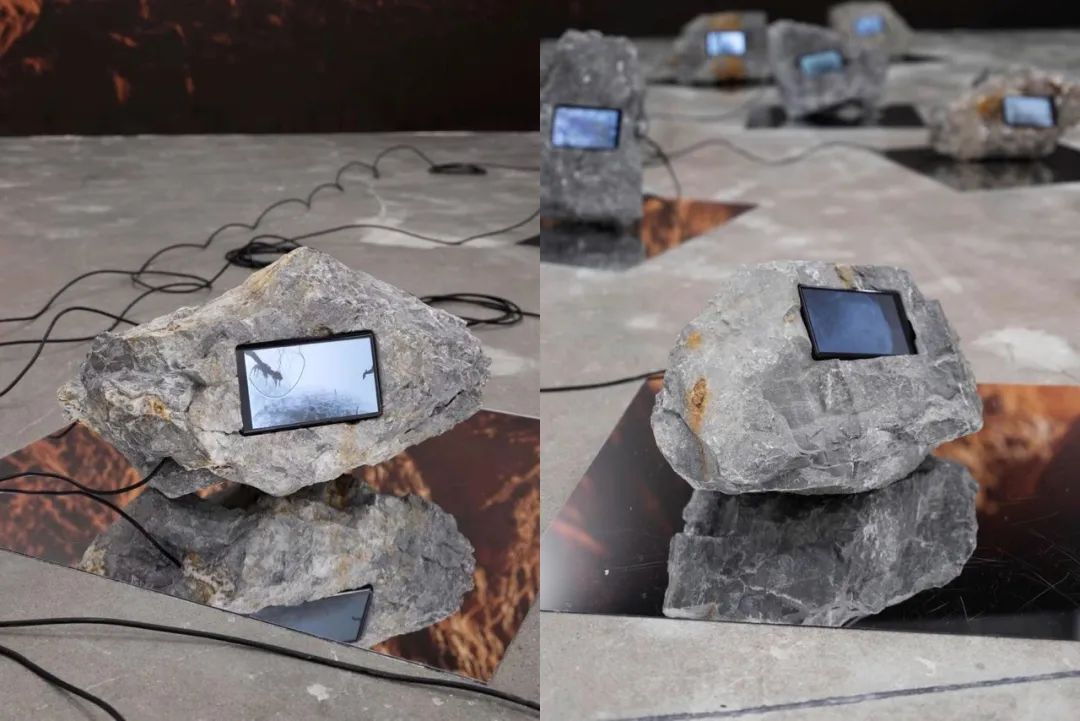 《心跳》在空间中的另一角,几颗石头零散地摆放于地面。它们来自于尾矿堆,是矿石在经过提取后残剩的部分,由陈萧伊在横断山上的废弃矿区中采集而来。每颗石头上的屏幕播放着被置于矿区与荒野边界间的红外摄像头所捕捉到的画面。屏幕上间或出现的漫步的动物、飞虫与一些无从知晓的动静提醒着我们,在这块对于人类而言不再具有价值的“人为遗迹”上,有着超出人类视野之外的存在。