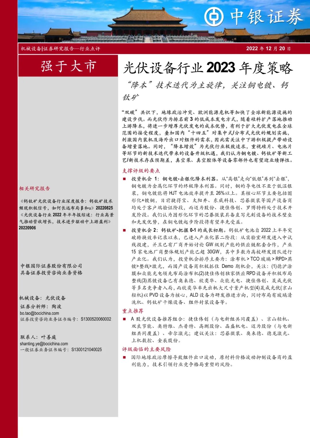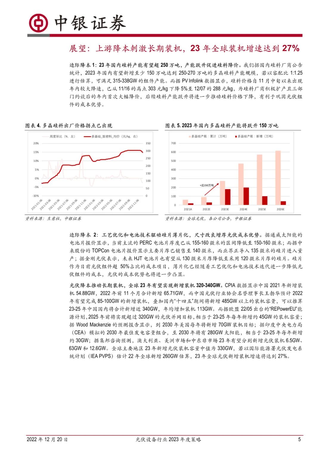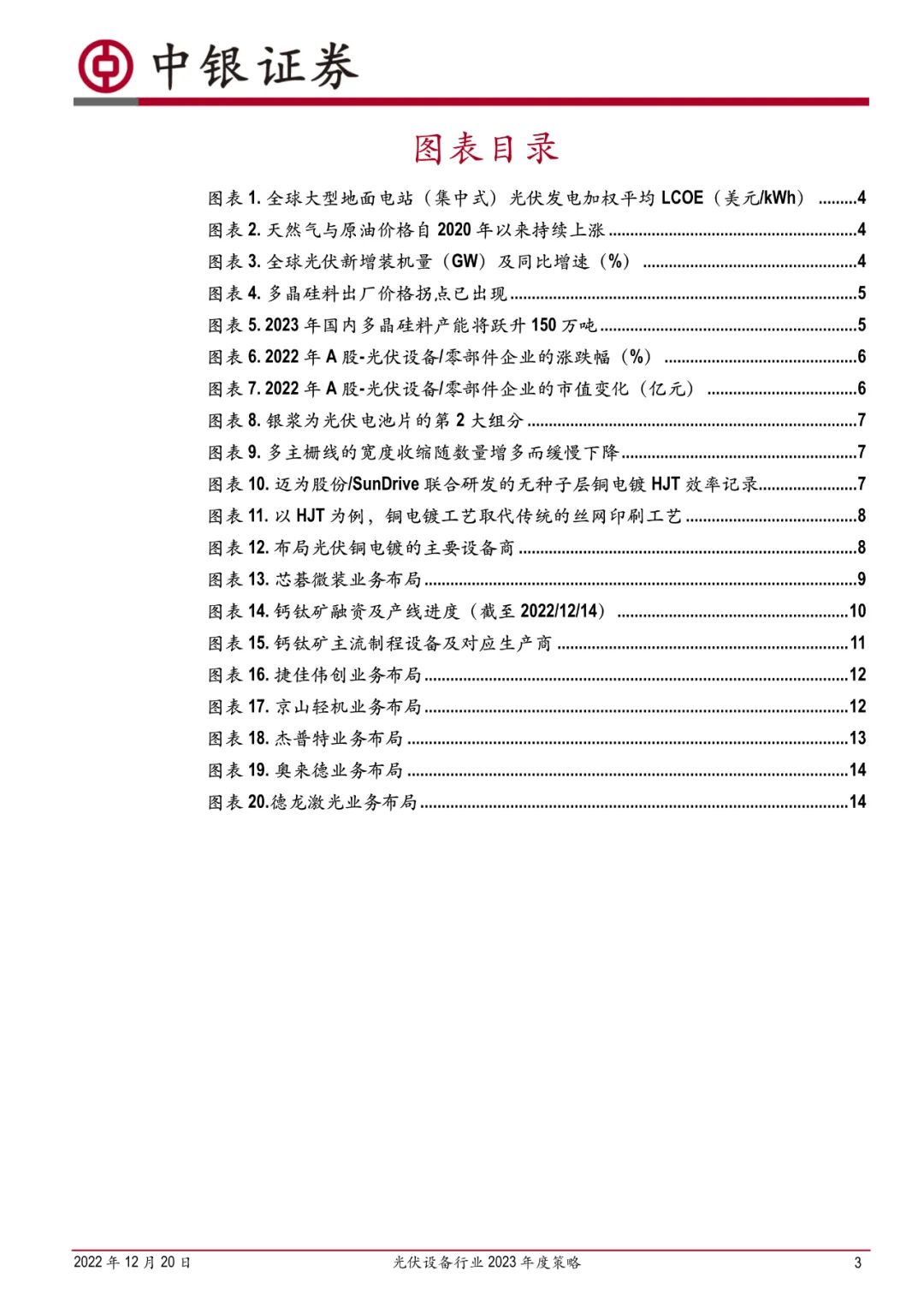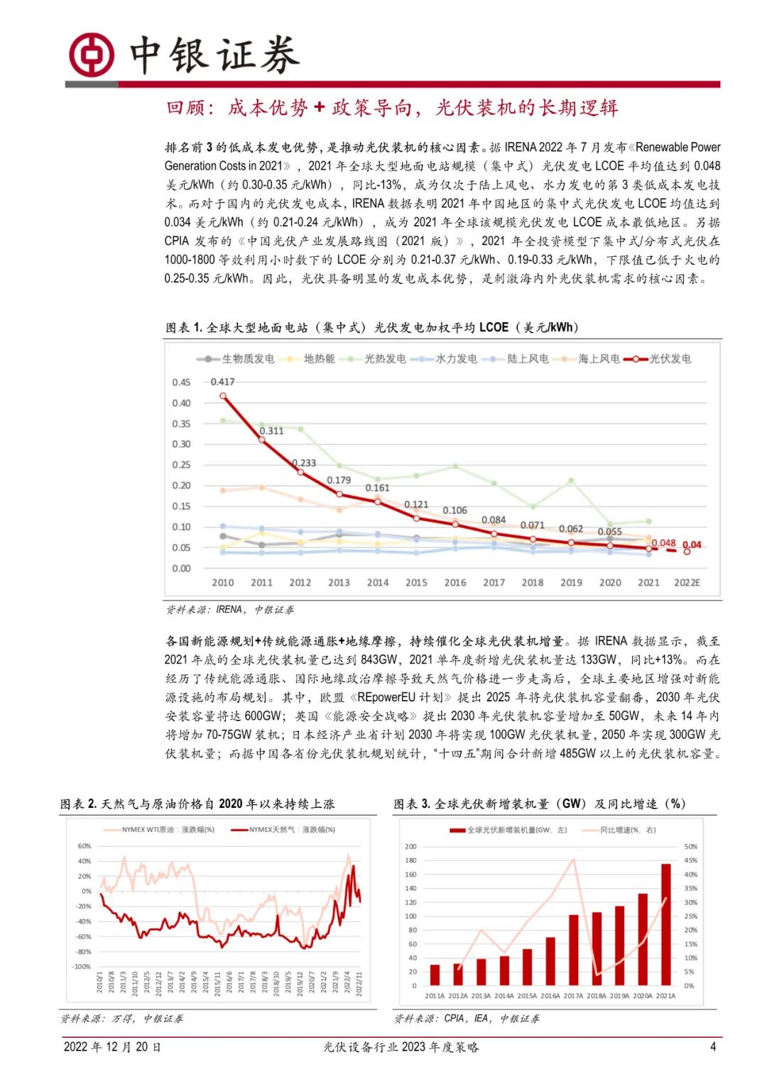 “双碳”共识下,地缘政治冲突、欧洲能源危机等加快了全球新能源设施的建设步伐。而光伏作为排名前 3 的低成本发电方式,随着硅料扩产落地推动上游降本,将进一步增厚光伏发电的成本优势,有利于扩大光伏发电在全球范围的接受程度,叠加国内“十四五”对集中式/分布式光伏的规划实施,刺激国内装机及海外出口对组件的需求,因此需关注中下游积极提产带动设备增量落地。