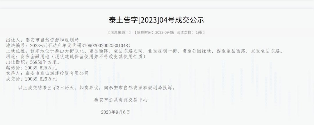 竞得人:泰安市泰山城建投资有限公司。