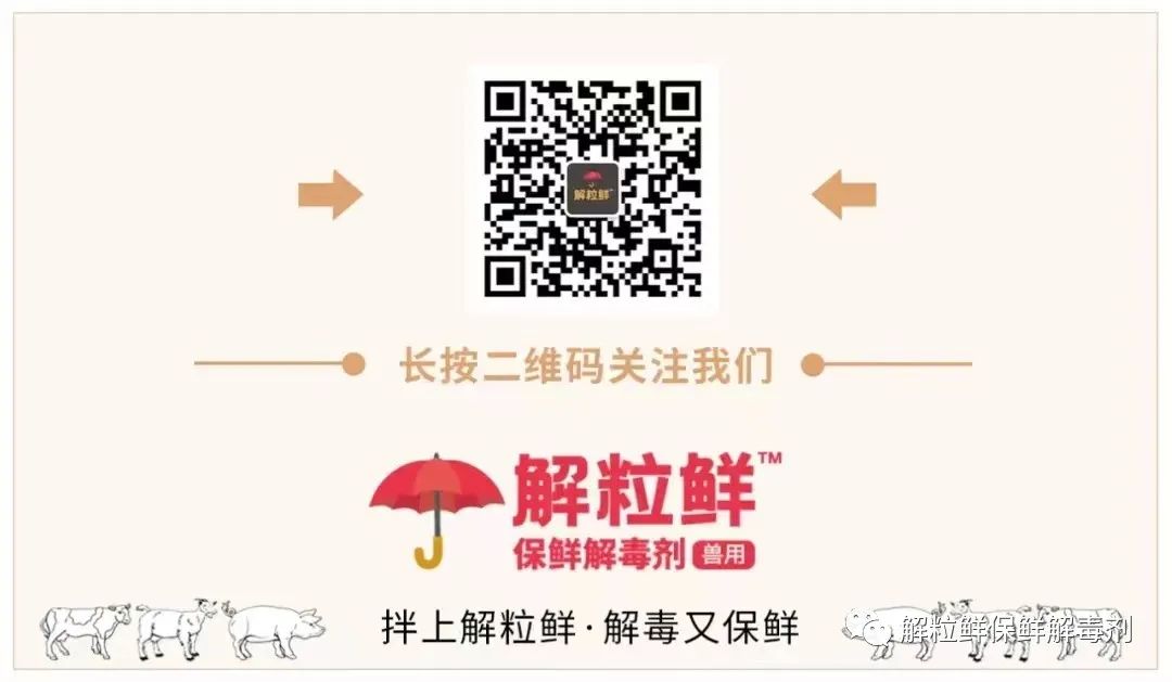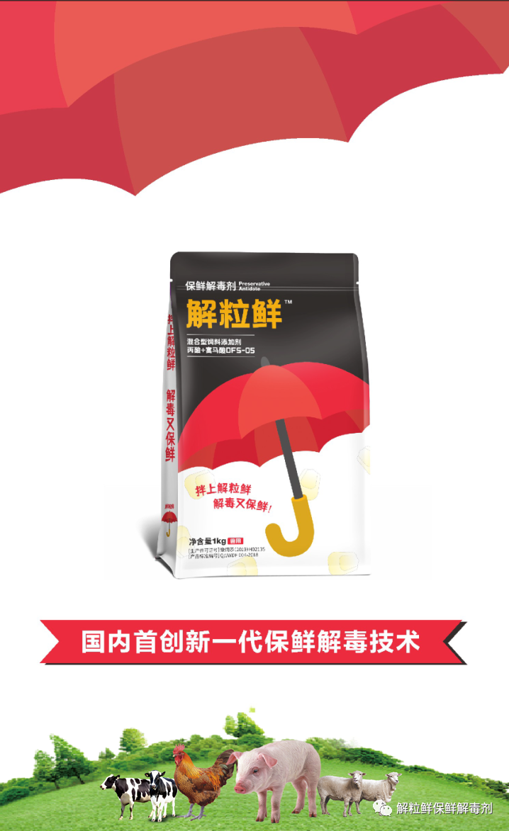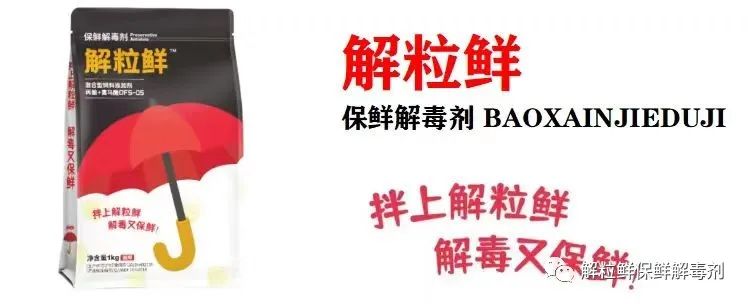 解粒鲜-保鲜解毒剂,以酸化剂为母体,通过分子定向化技术,改造和修饰其分子结构而成的结构衍生物,有极强的杀菌作用,从源头抑制霉菌毒素产生,延长饲料保鲜时间,保护饲料不受霉菌污染;生物降解酶和降解菌与霉菌毒素进行不可逆的结合,变成无毒的物质排出体外,从而起到保鲜饲料、清除各种霉菌毒素、改善饲料适口性、保护肠道健康等多种功效。开创了“体外饲料保鲜,体内高效解毒”的技术先河。