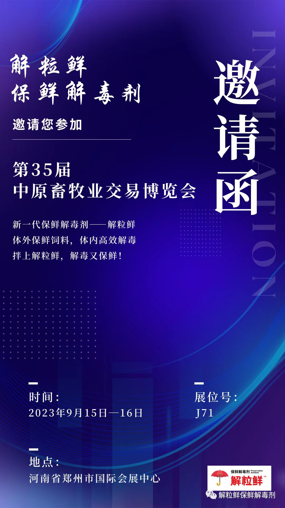 解粒鲜保鲜解毒剂——新一代保鲜解毒剂产品。解粒鲜®(开封金万德福生物科技有限公司)在综合企业展区-J71展位,诚挚邀请广大经销商和养殖业主莅临参观,给我们一个互相了解、增进友谊的机会,让解粒鲜与您一起共赴这场精彩纷呈的畜牧盛会!