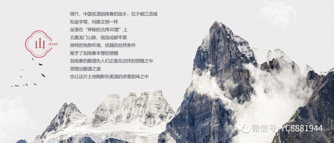 地处中国白酒金三角上游,绵竹的季风甘露,携带着青藏高原的纯净,从这片土地上经过。这里的山之浑厚、水之圣洁,都被剑南春的美酒演绎得淋漓尽致。