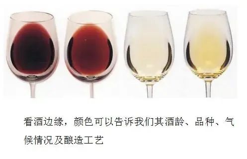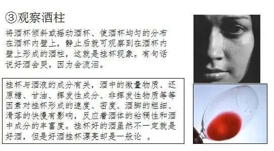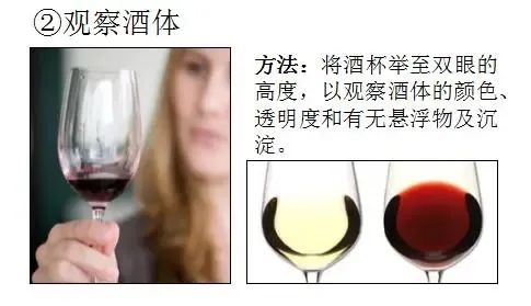 看液面、酒的颜色、挂杯现象、酒体流动性、澄清度、光泽等