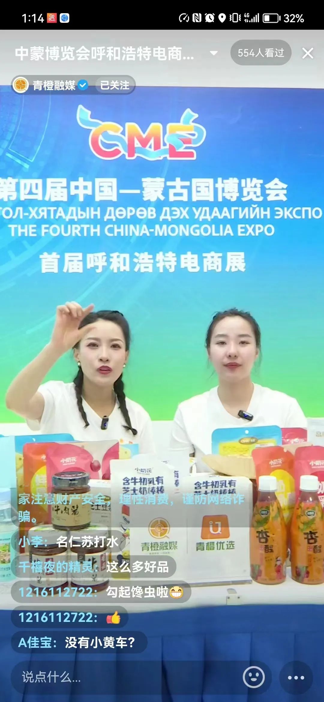 2023年9月6日至10日第四届中国-蒙古国博览会在敕勒川国际会展中心盛大举行。同时以“电商发展引领新格局·数字结合创赢新成果”为主题的首届呼和浩特电商展也在第四届中蒙博览会上亮相,9月8日,青橙融媒亮相首届呼和浩特电商展,同时以“青橙优选”抖音账号直播带货正式上线运营,迈出媒体融合改革发展的重要一步。