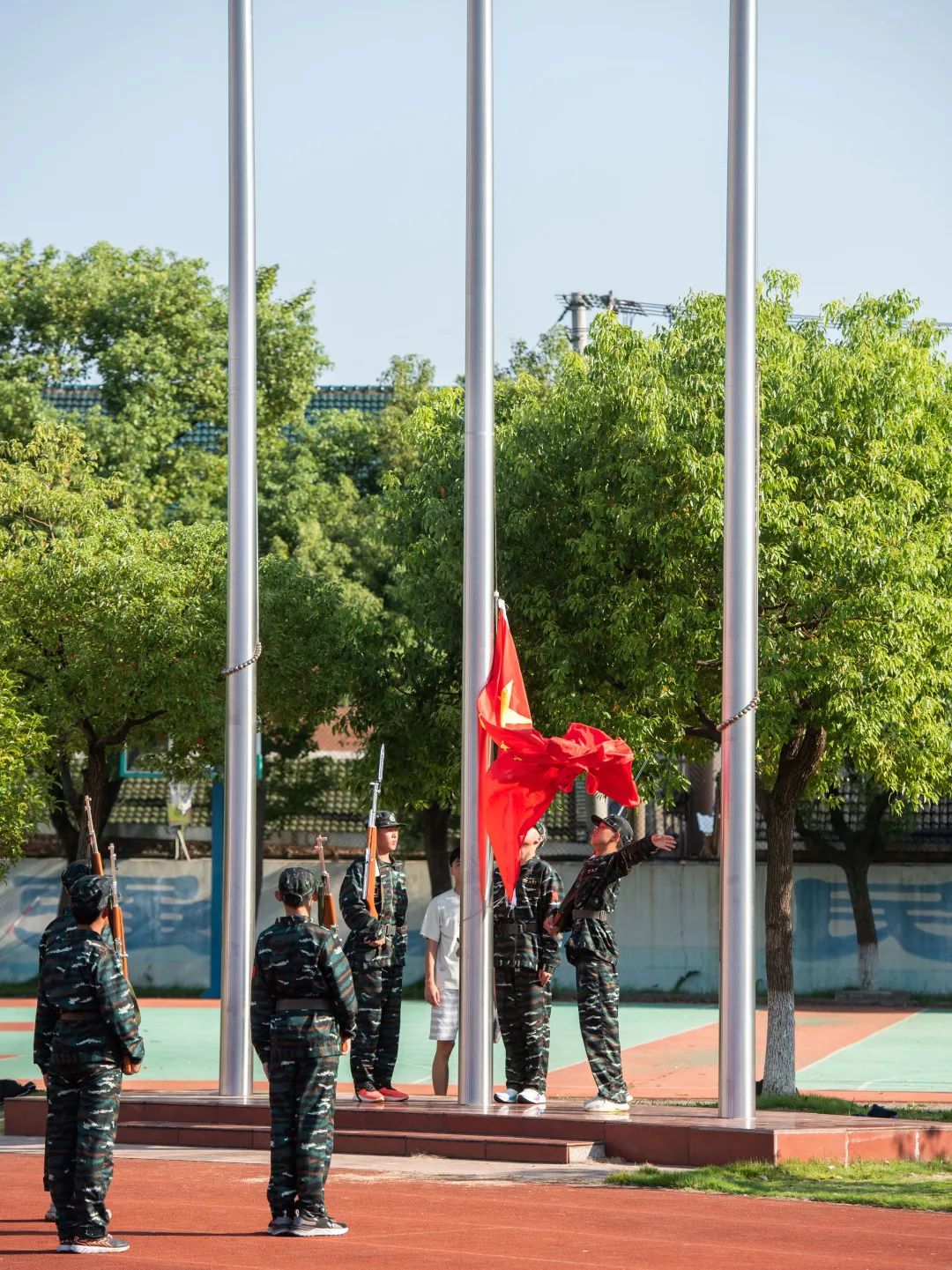 五星红旗冉冉升起,义勇军进行曲萦绕在耳,在庄重肃穆的国歌声中,同学们目光坚毅,军容整齐。