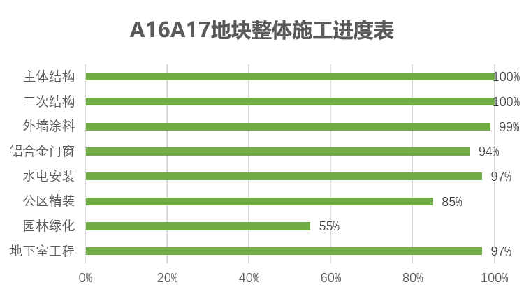 主体结构完成100%,二次结构完成100%,外墙涂料完成99%,铝合金门窗完成94%,水电安装完成97%,公区精装完成85%,地下室机电完成97%,电梯安装完成100%,园林绿化完成55%。