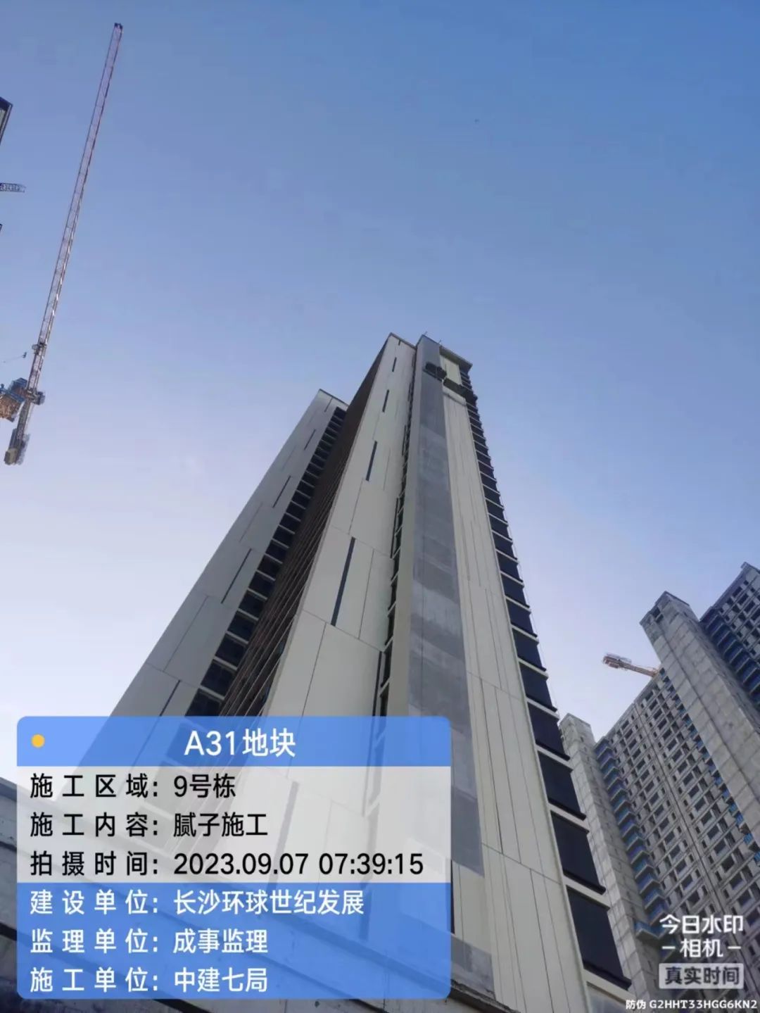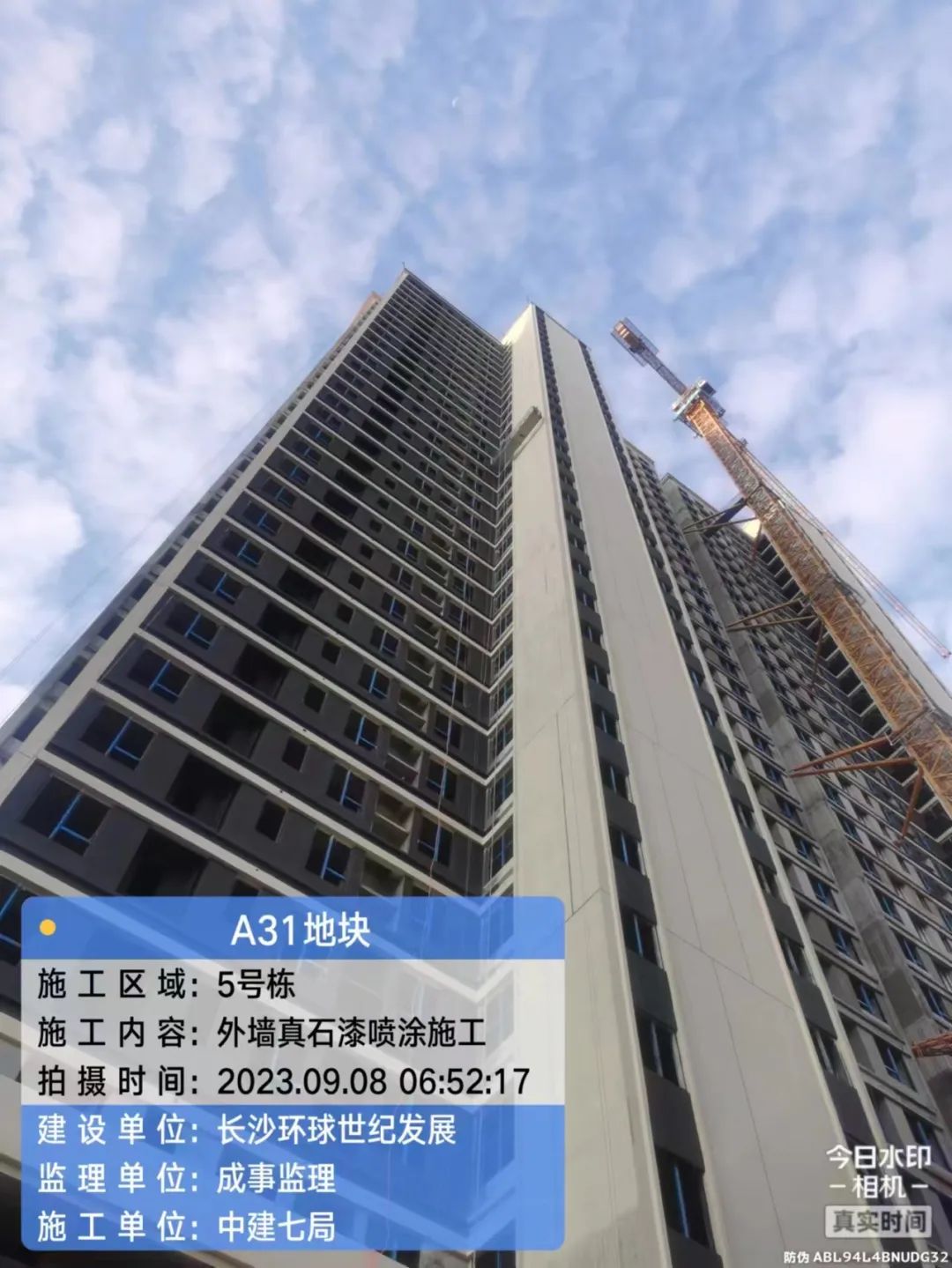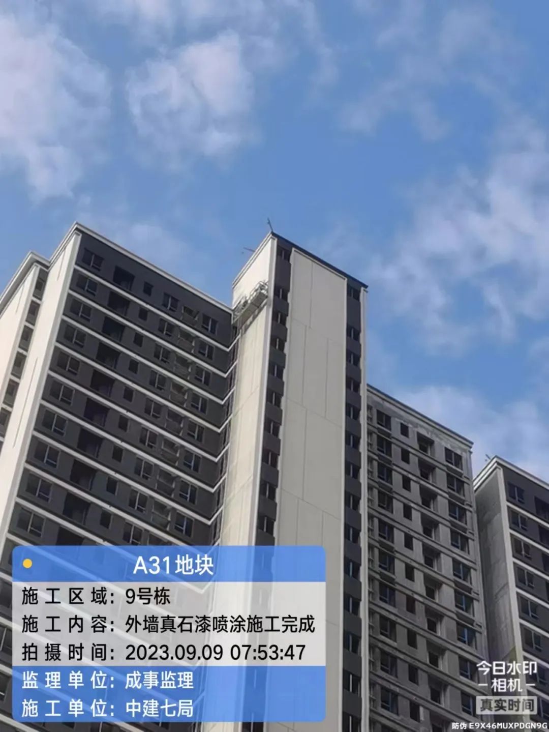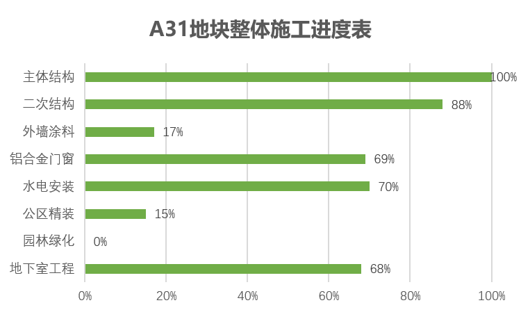 主体结构完成100%;二次结构完成88%;外墙涂料完成17%,铝合金门窗整体完成69%;水电安装完成70%;公区精装完成15%,地下室工程完成68%。