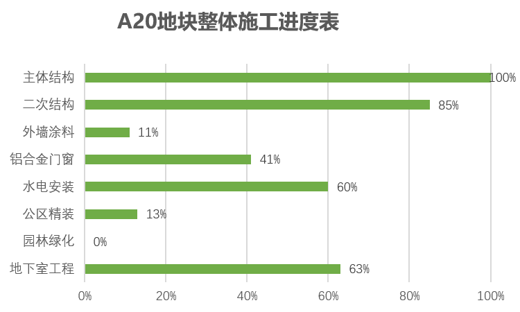主体结构完成100%;二次结构完成85%(砌筑完成99%;抹灰完成99%;保温完成49%),铝合金门窗、栏杆完成41%;水电安装完成60%;地下室工程完成63%,公区装修完成13%,外墙涂料完成11%。