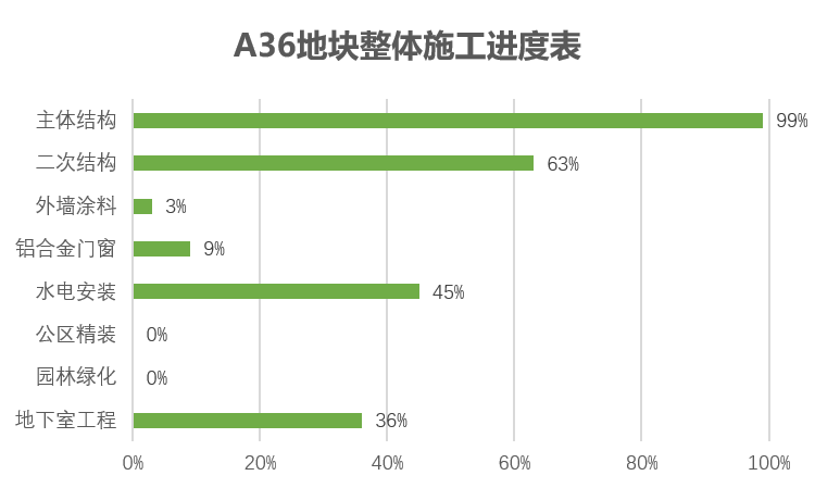 主体结构完成99%;二次结构完成63%;水电安装完成45%;锌钢栏杆安装20%;地下室工程完成36%;外墙完成3%,铝合金门窗安装完成9%(其中窗框完成27%)。