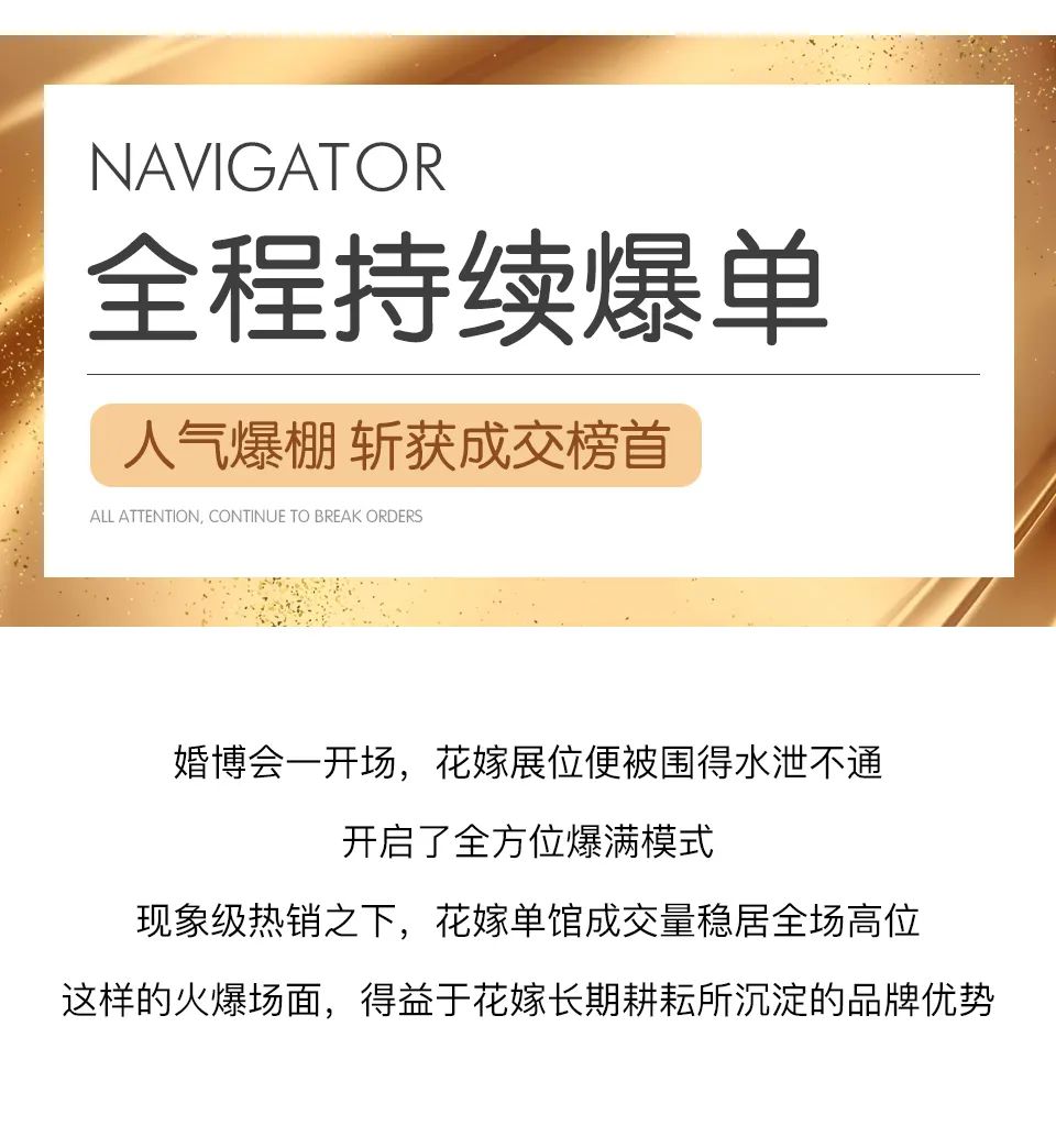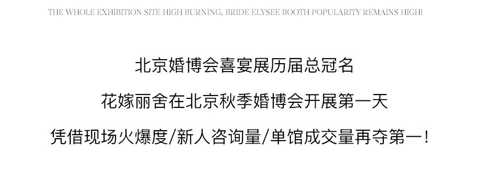 花嫁丽舍在北京秋季婚博会开展第一天凭借现场火爆度、新人咨询量、单馆成交量再夺第一!花嫁开启了全方位爆满模式,得益于其长期耕所沉淀的品牌优势。