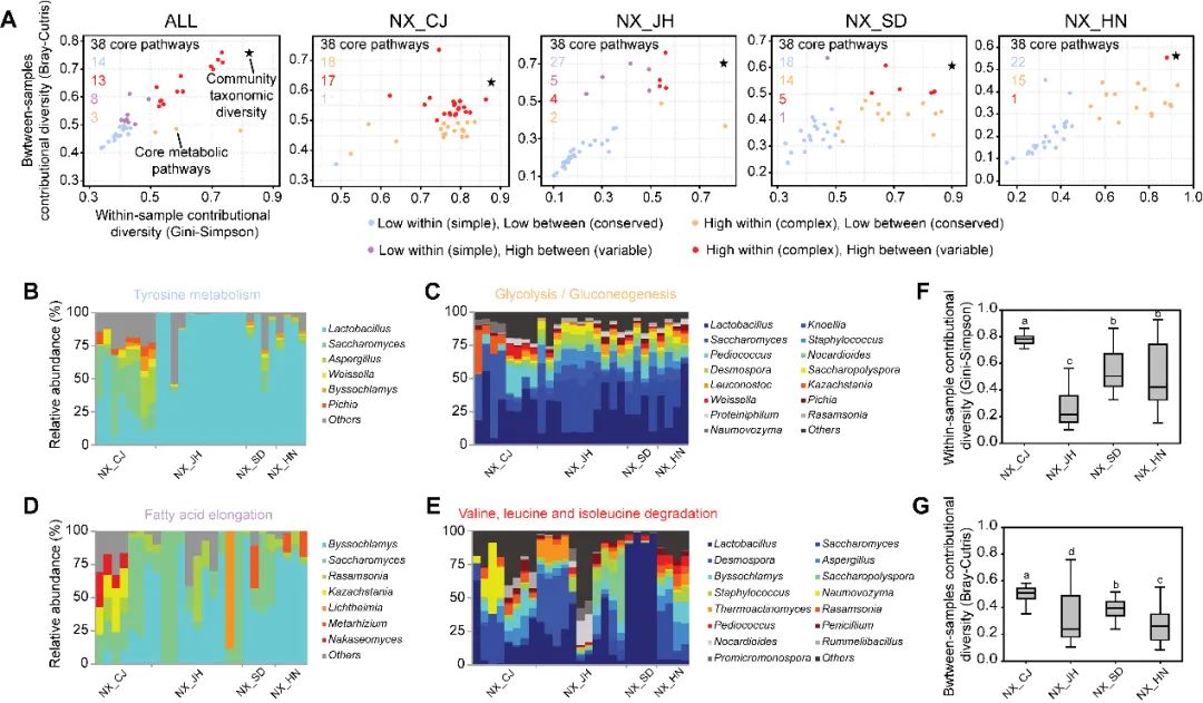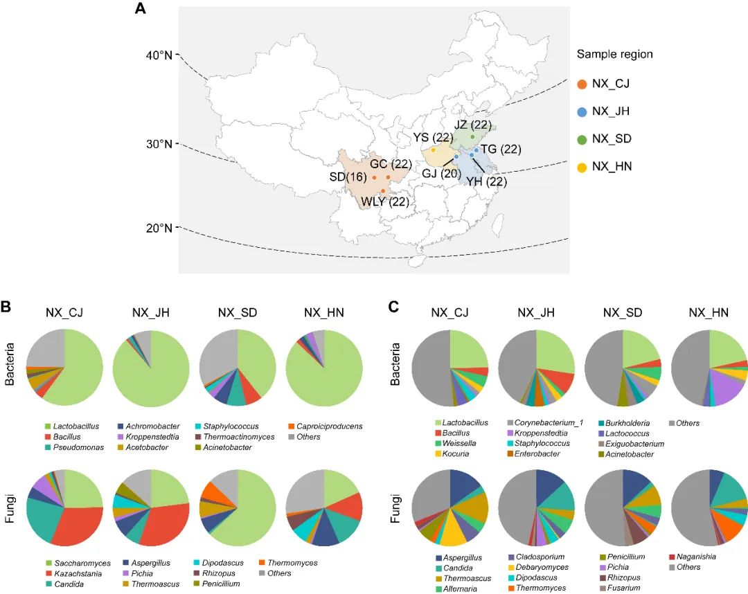 文章系统分析了我国四大代表性浓香型白酒产区环境和糟醅发酵过程中的微生物组成、代谢功能和风味化合物。