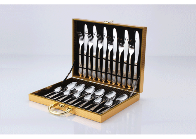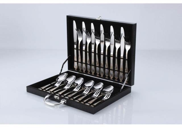 材质: 430不锈钢餐具/木质礼盒/组件:餐刀、餐叉、餐勺水果叉各6支