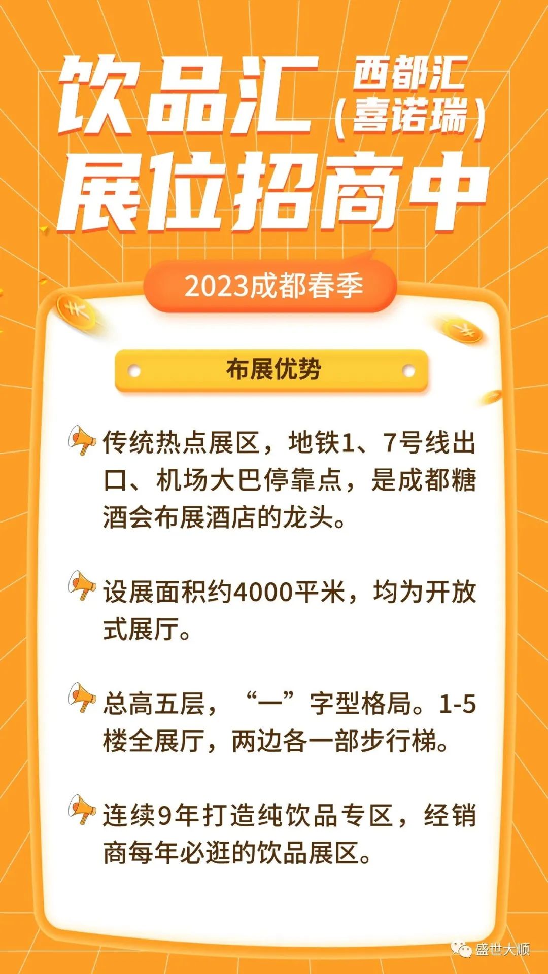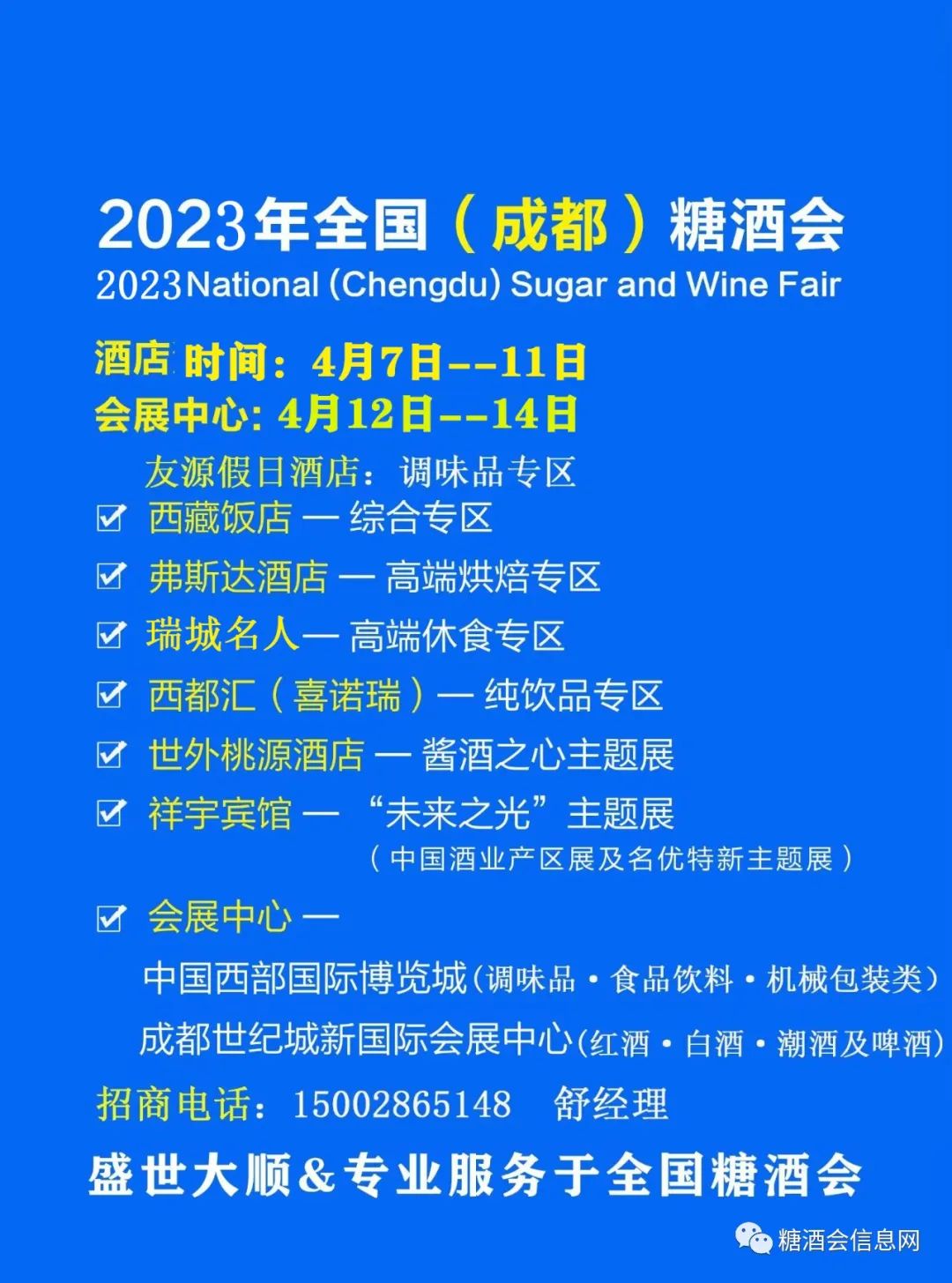 2014年至2022年成都春季糖酒会成功打造品牌饮料布展区,火爆招商,开展期间全国各地销商来此参观、驻足、挑选产品,汇源果汁,王老吉,修正集团,北京战狼,完达山,香港禧茶, 北京让茶,水茫茫,蒙水集团,雪宝集团,华北集团,东君乳业, 湖南太子奶集团,旺他集团, 海南椰岛,厦进乳业,欧亚乳业,广东喜乐乳酸菌,山东玉泉罐头,伊春市忠芝集团(蓝莓饮料),湖北今贝、邓老凉茶,厦门中绿、喜秋林格瓦斯、维维集团(东方红饮品)、益和源,广东贝奇饮品、板蓝花饮料、山西大寨核桃、东桑凉茶、陕西绿梦饮品,九芝堂,隐雪集团,浙江李子园等知名企业参 展。