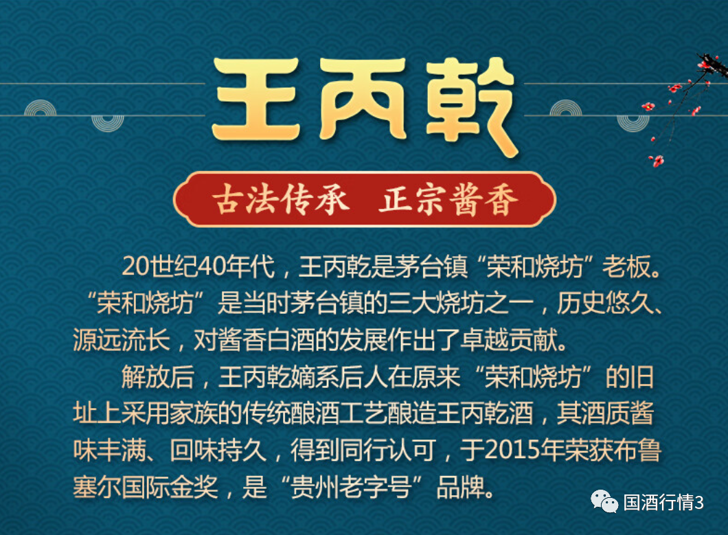 贵州省仁怀市王丙乾酒业有限公司于2016年05月17日成立。位于贵州茅台镇,是一家酿造酱香白酒的公司。公司酿造基地位于贵州茅台镇赤水河畔,占地150亩,现有窖池118个。公司历史1879年“荣和烧坊”创立;1915年8月“荣和烧坊”酿造的王茅酒,参加旧金山“巴拿马太平洋国际博览会”,酒罐一掷震世界,从此“荣和烧坊”酿制的“茅台酒”享誉世界,成为世界三大蒸馏名酒;1916年6月,美国又在加州圣迭戈举办了“巴拿马加利弗尼亚国际博览会”,王茅酒再次受邀参展,又获金奖.