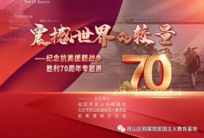 为纪念抗美援朝战争胜利70周年,更好地传承和弘扬伟大的抗美援朝精神,赓续红色血脉,由房山区档案馆、房山区退役军人事务局、抗美援朝纪念馆联合举办的“震撼世界的较量——纪念抗美援朝战争胜利70周年专题展”在区档案馆展出,为了让更多市民朋友观看到展览,我们现推出线上展示板块。