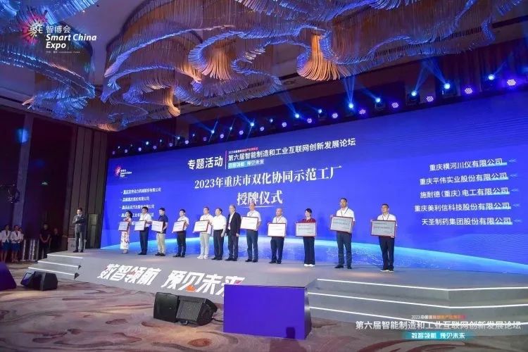 论坛上隆重举行了“2022年度国家级智能制造示范工厂揭榜单位和优秀场景”授牌仪式,重庆华峰化工有限公司获评“国家级智能制造示范工厂揭榜单位”,全市仅6家企业获此殊荣。与此同时,同台登场的华峰重庆氨纶有限公司作为全市10家获评企业之一,荣获“2023年重庆市双化协同示范工厂”称号。