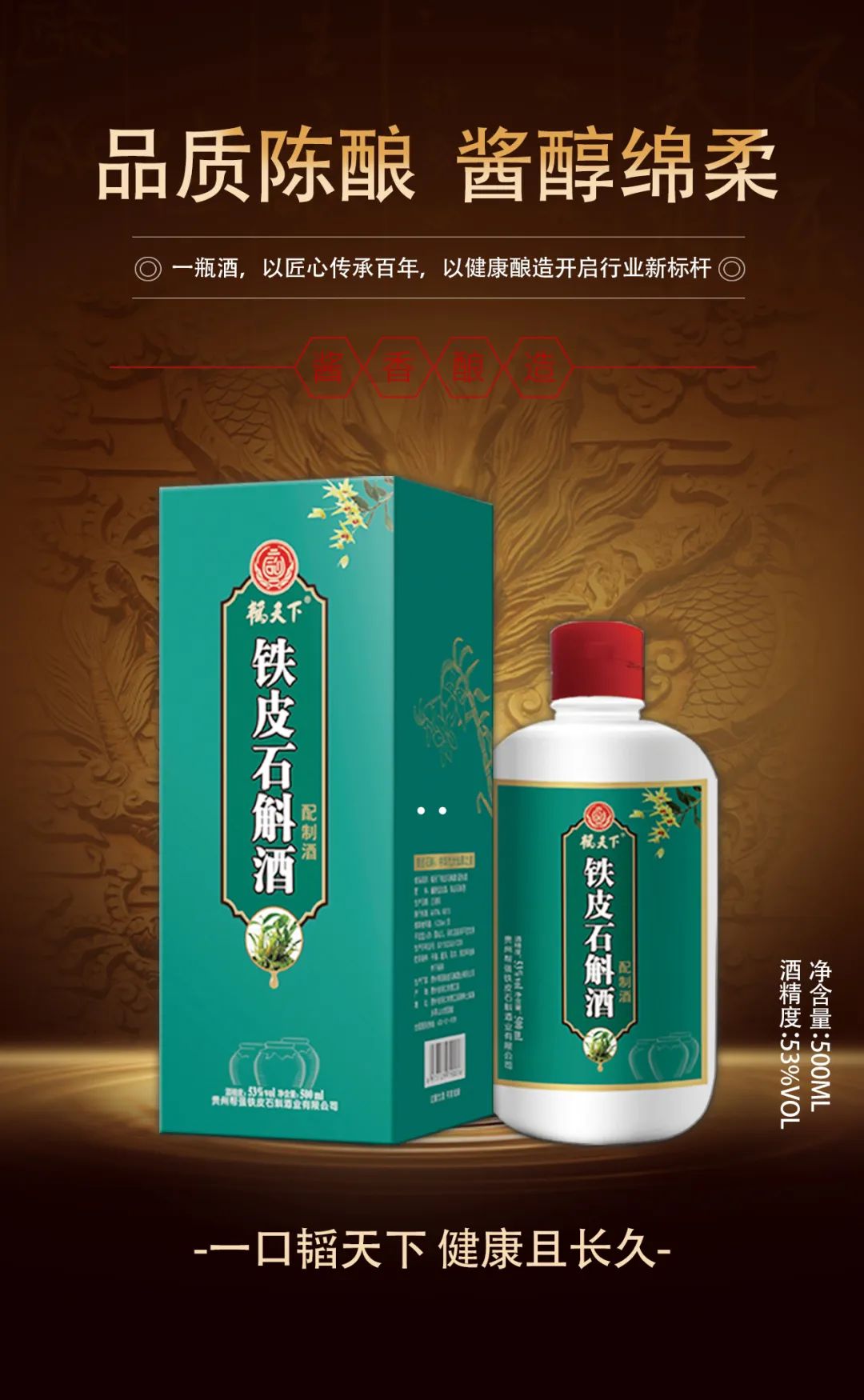 韬天下铁皮石斛酒是一种将铁皮石斛和酱香型白酒相结合的独特酒产品,它的生产工艺传统而复杂,首先需要通过传统的酱香酒酿造工艺——12987工艺,将优质的原料经过挑选和预处理,然后进行糖化、发酵、蒸馏、陈酿、勾调得到一批高品质的韬天下基酒,接着适量加入铁皮石斛,二者相互作用,使得铁皮石斛的营养成分能够充分溶解于白酒中,经过存放和陈化,最终得到一款拥有铁皮石斛功效的韬天下铁皮石斛酒,其酒体微黄、口感绵柔、回味甘甜让人恋恋不忘。