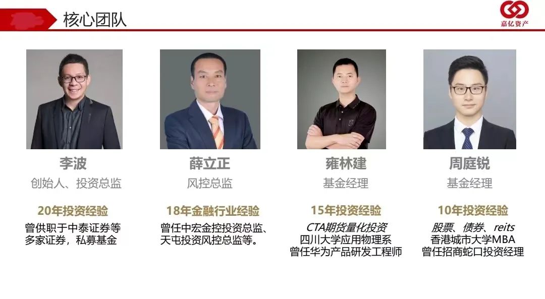 嘉亿资产以专业,精进,诚信,开放、对客户负责,对自己负责、信用比黄金更重要价值观为客户价值选股。建立趋势择时,估值定仓,波动降本,严格风控的投资体系。