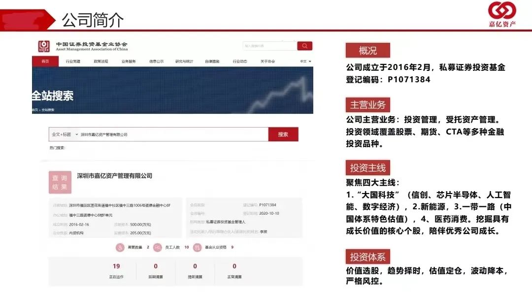 深圳市嘉亿资产管理有限公司成立于2016年2月,主营业务投资管理,受托资产管理。投资领域覆盖股票、期货等多种金融投资品种。公司聚焦医药、消费、科技三大行业,挖掘具有长期成长价值的核心个股,陪伴优秀公司成长。