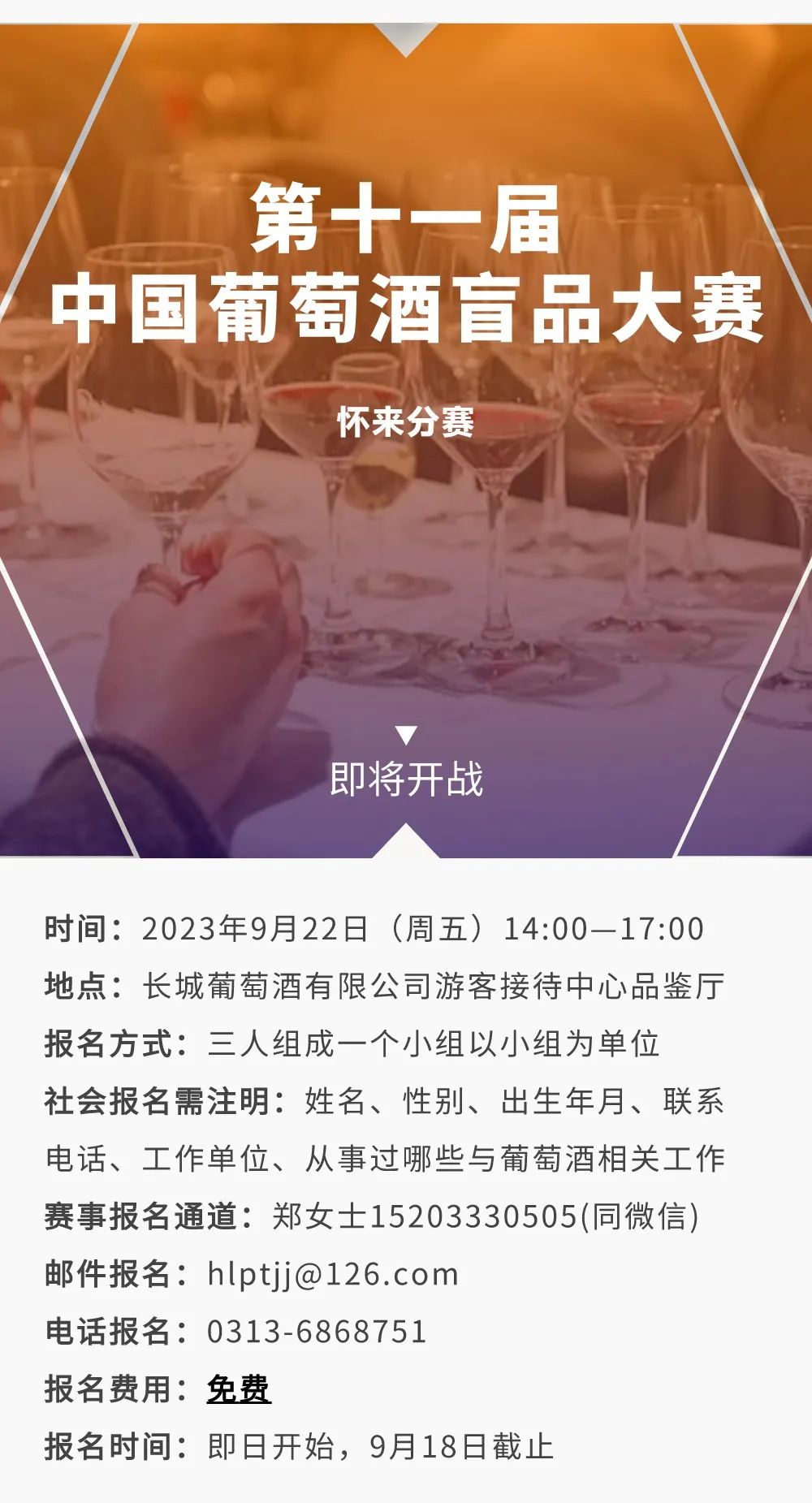2023中盲/第十一届中国葡萄酒盲品大赛·怀来分赛区比赛由怀来县葡萄酒局主办,上海酌享文化传播有限公司承办。凡年满十八岁的社会爱好者均可报名参加,三人一小组,以小组方式晋级。获得怀来分赛区第一名的小组选手可获得赴上海参加总决赛(2023/10/22)的资格。参加总决赛的小组选手的交通及住宿费用由主办方按照相关标准承担。小组成员均颁发“怀来产区葡萄酒推广大使”的荣誉称号,每人均可获得1000元奖金。