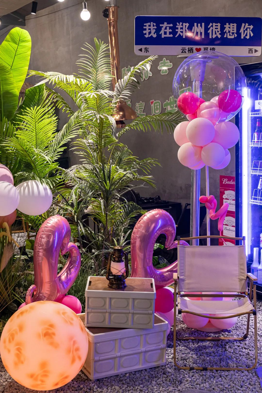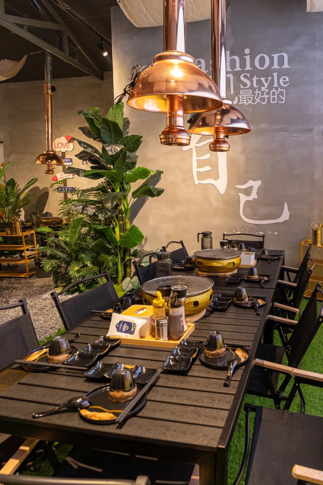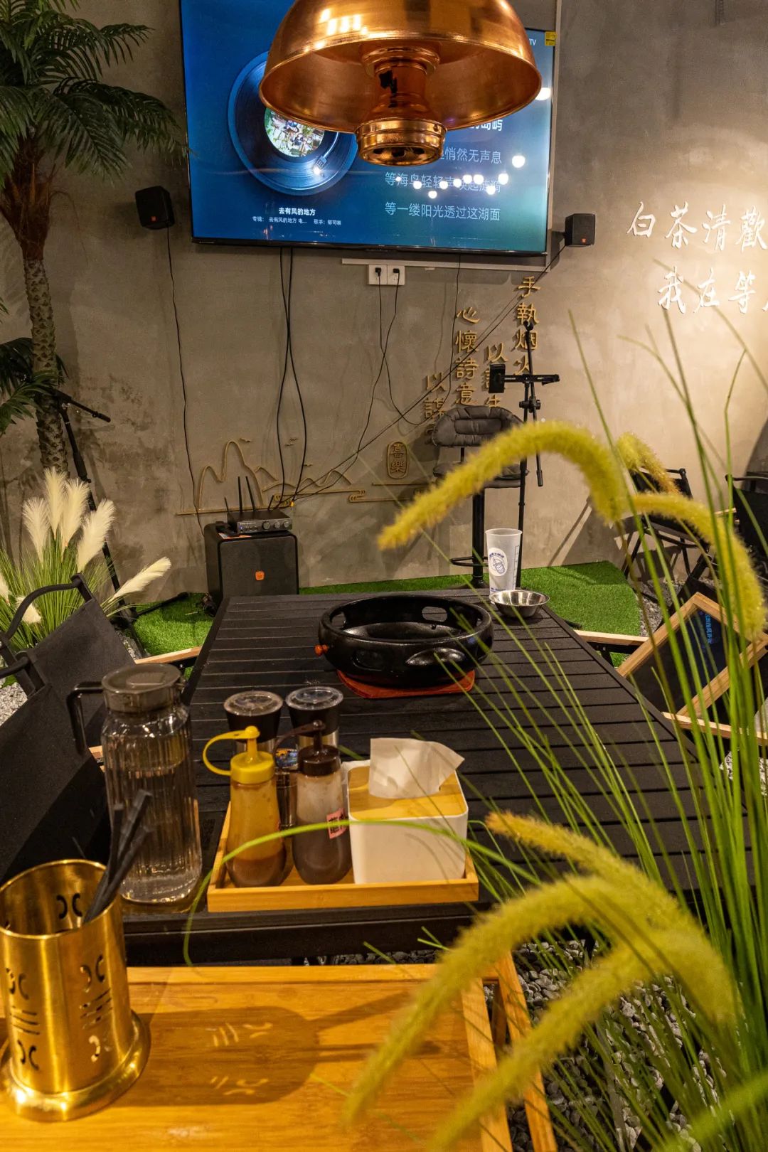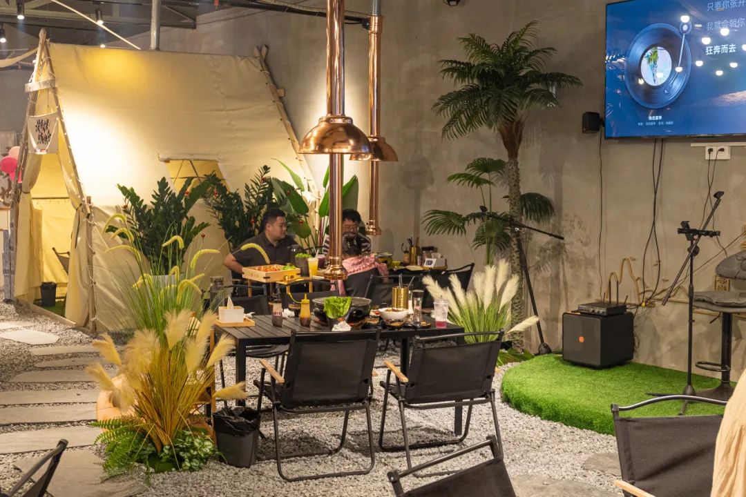 逼真的夕阳霓虹灯光、茅草遮顶、绿植环绕,还有木质露营桌椅,细节之处都是经过精心布置,直接将户外露营氛围拉满~