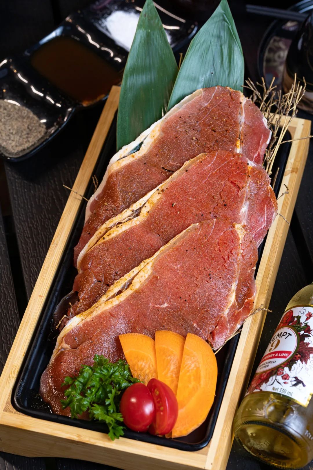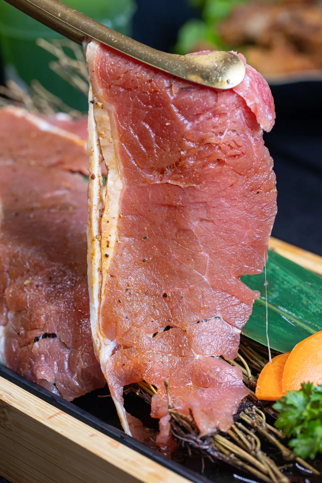 精选优质谷饲牛肉,油脂纹理分布清晰,肉质软嫩,油脂和瘦肉的结合使肉有弹性却不柴,光看着就让人垂涎欲滴。