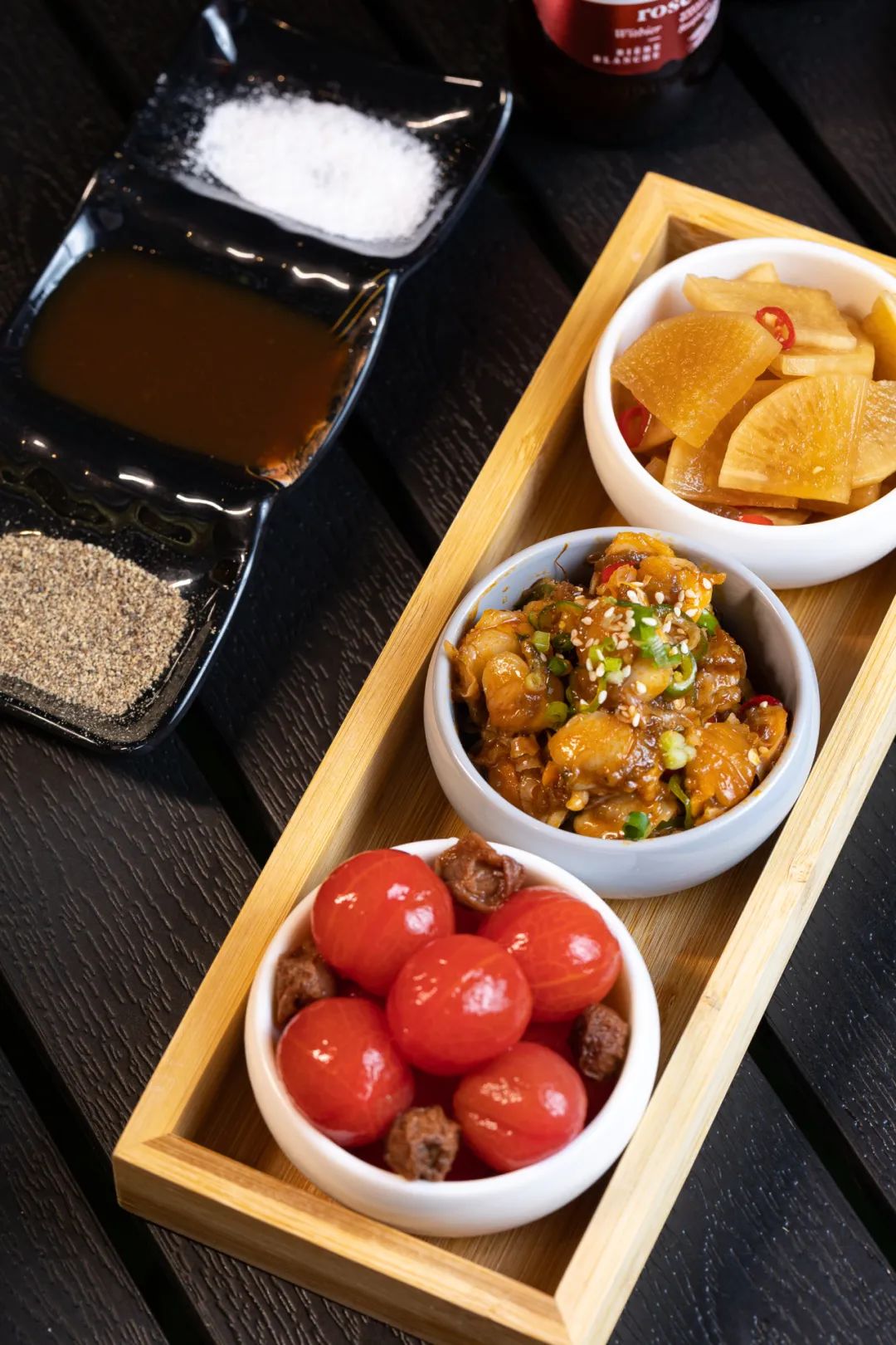 调味贝肉、话梅番茄、腌萝卜,三款经典小吃配上烤肉,美味势不可挡。