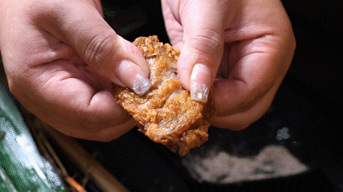 小翅根炸得一级酥脆,脆到极致的同时,也薄到极致。整只鸡腿肉眼看到多大实际就是多大,完全不存在用空壳“充个头”的可能。