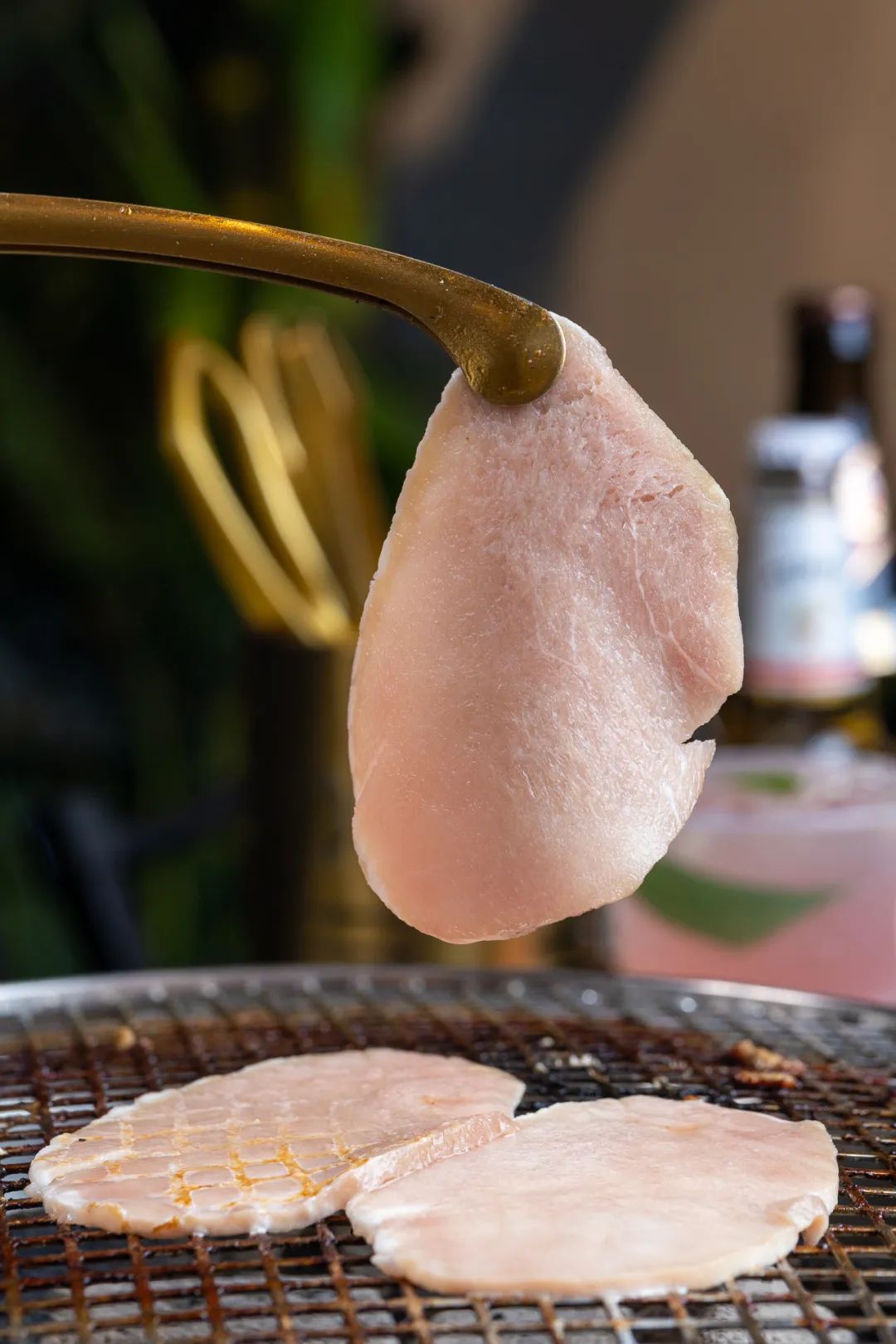 没有经过腌制的猪梅花,烤制熟透时撒上沾上秘制酱料,既能品味 食材本身的原汁原味,口感上更丰富,外皮焦香让人欲罢不能。