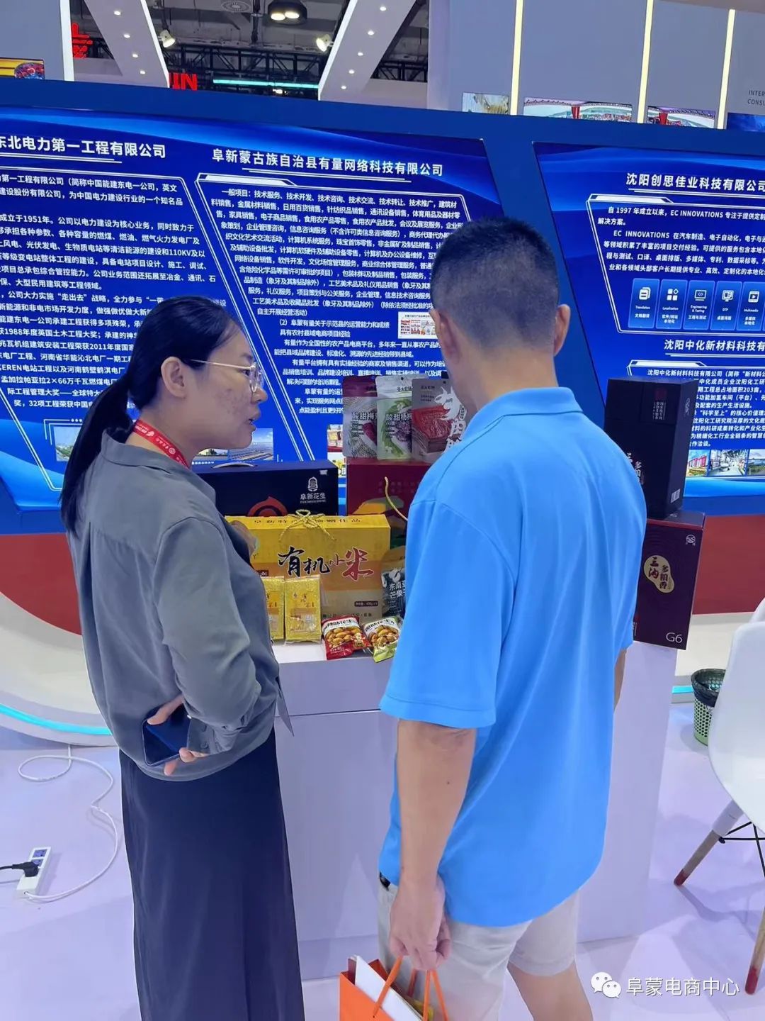 在投洽会期间,阜新县电子商务公共服务中心应邀参展,并设立了展示阜新县农特产品的展台,产品包括杂粮煎饼、有机小米、粗粮面等。为了让客户更好地了解阜新县的产品,我们在展位上设置了展示板,并由现场工作人员详细介绍了产品的种类、特点和优势,吸引了大量的参观者。此外,我们还提供了试吃活动,让客户更好地感受到产品的口感和质量。在展会期间,我们积极与客户交流,了解他们的需求和反馈,以便更好地促进合作。