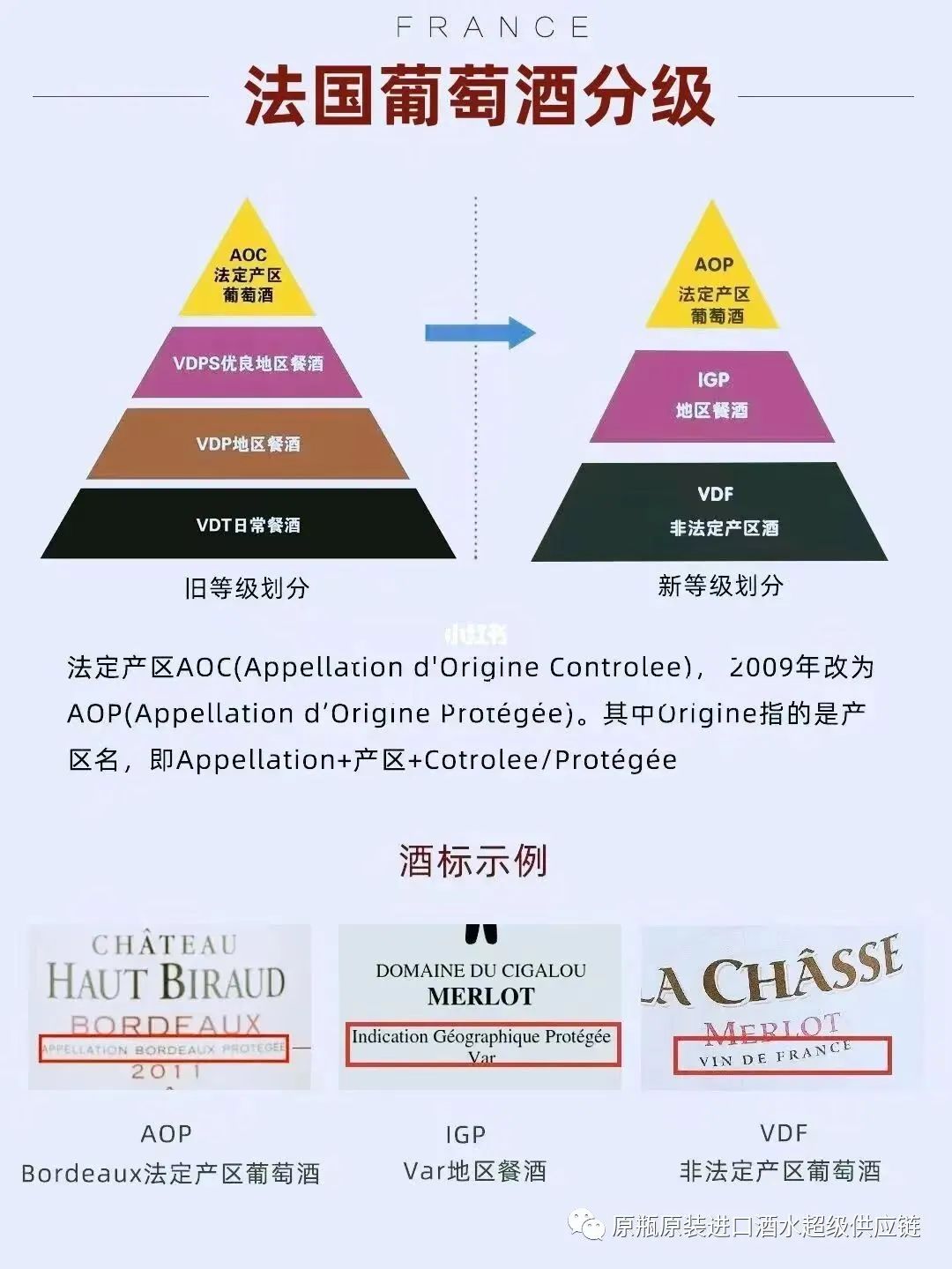 2009年,进行了一次大改革,AOP分级制度取代了原有的AOC制度,AOC和VDOS级别合并为 AOP,VDP改名为IGP,VDT改名为VDF。不过,尽管2012年颁布的新分级体系行了数年,许多生产商如今仍然习惯采用 VdT、VdP、AOC这些原有术语来标注葡萄酒。