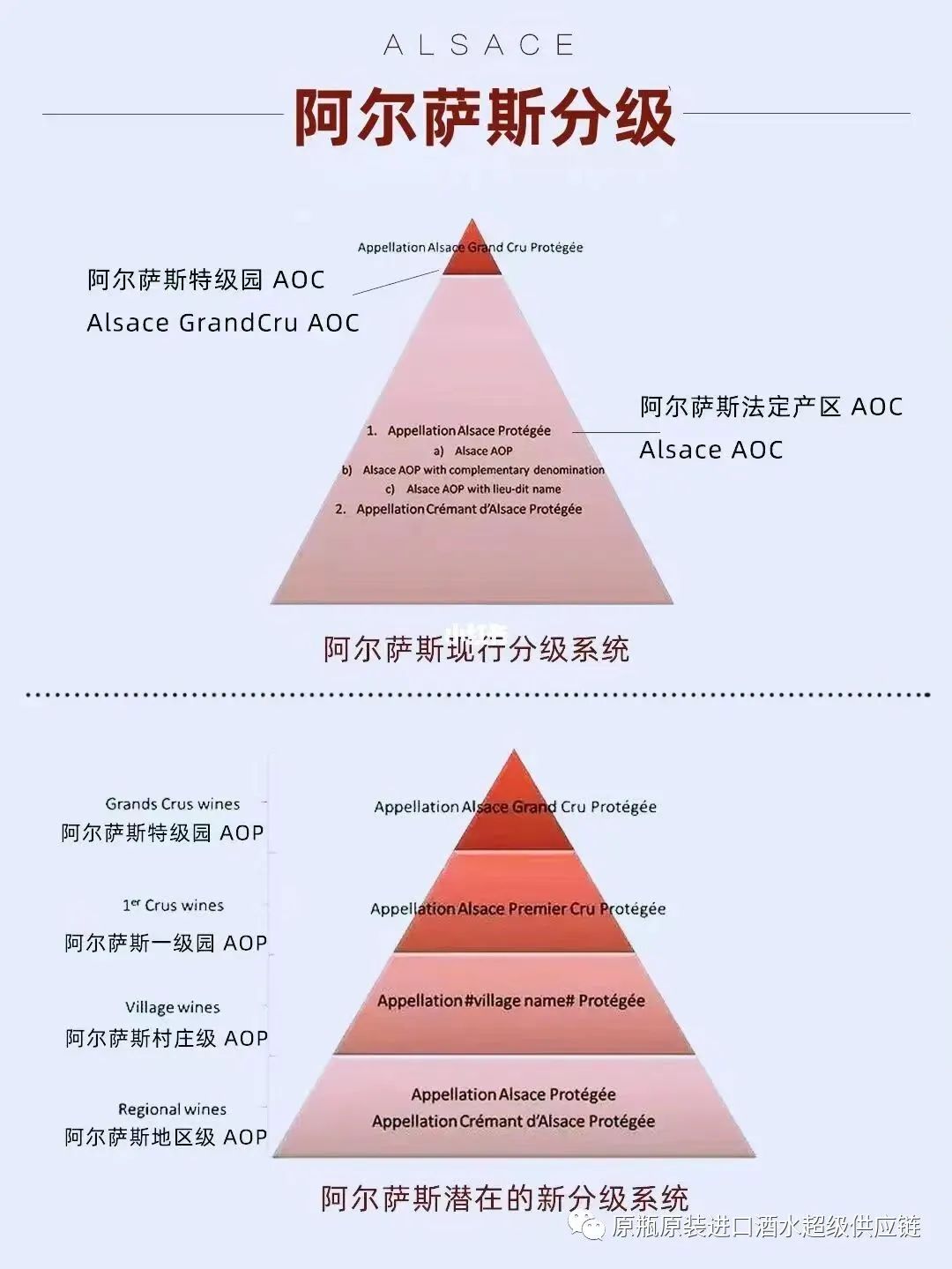 阿尔萨斯静态葡萄酒分为Appellation Alsace Controlee(阿尔萨斯法定产区)和Appellation Alsace Grand Cru Controlee(阿尔萨斯特级园法定产区)。