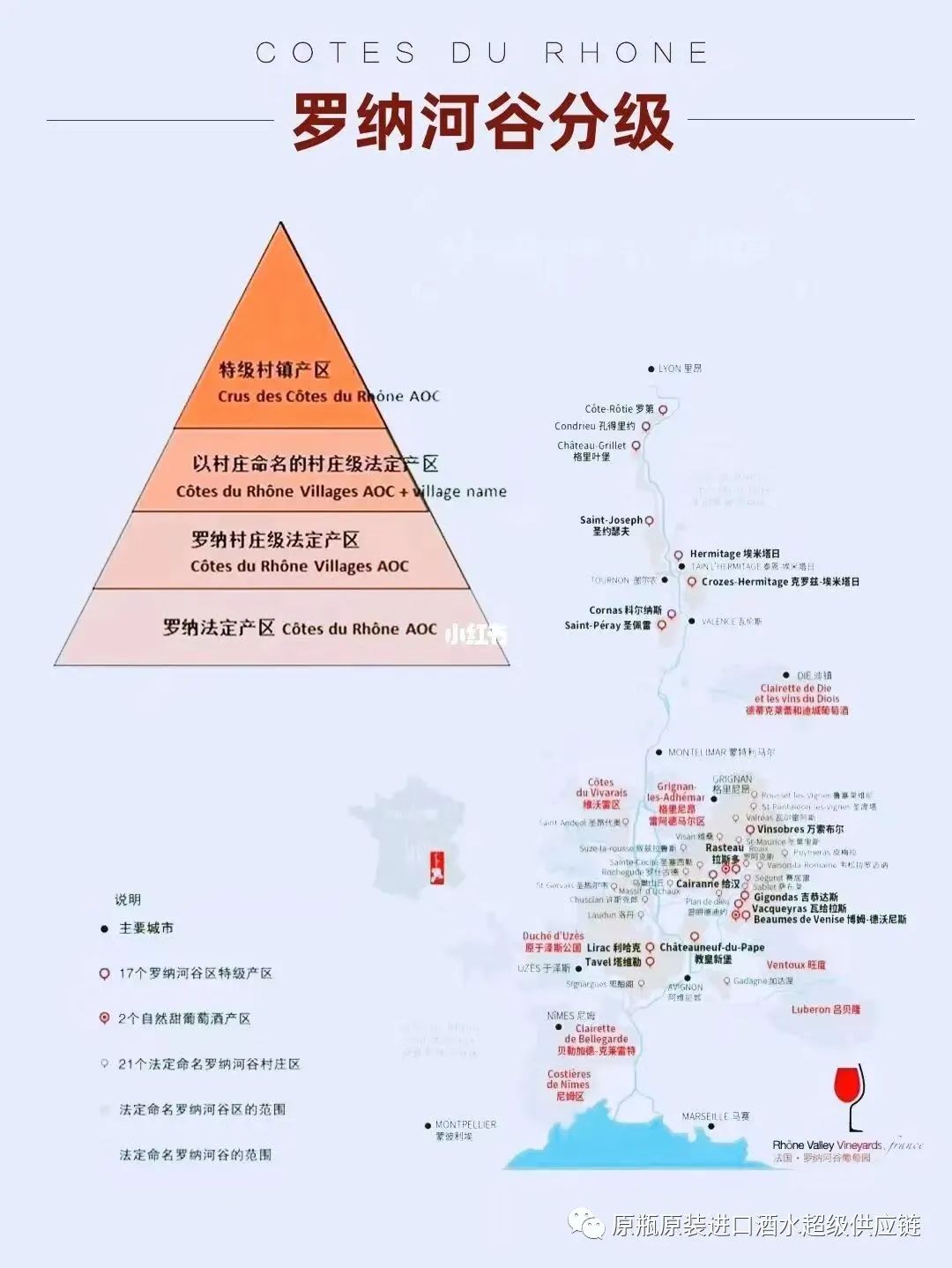 分为罗纳河谷法定产区(Cotes du Rhone AOC),罗纳河谷村庄级法定产区(Cotes du Rhone Villages AOC).罗纳河谷村庄级法定产区(Côtes du Rhône Villages + village name AOC),罗纳河谷法定特级村镇产区(Crus des Cotes du Rhone AOC)